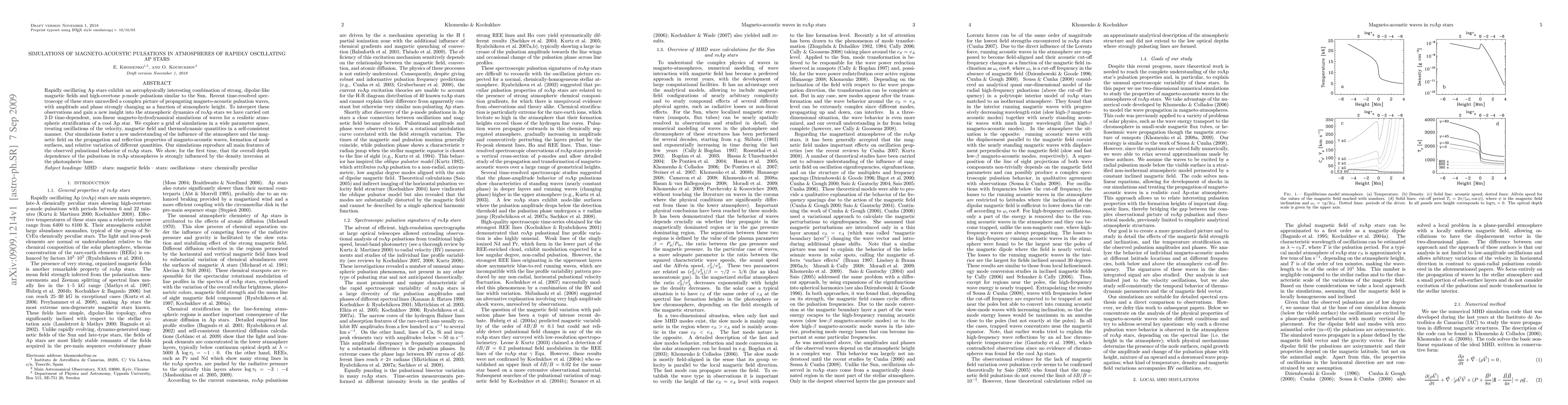 Rapidly oscillating Ap stars exhibit an astrophysically interesting combination of strong, dipolar-like magnetic fields and high-overtone p-mode pulsations similar to the Sun. Recent time-resolved spectroscopy of these stars unravelled a complex picture of propagating magneto-acoustic pulsation waves, with amplitude and phase strongly changing as a function of atmospheric height. To interpret these observations and gain a new insight into the atmospheric dynamics of roAp stars we have carried out 2-D time-dependent, non-linear magneto-hydrodynamical simulations of waves for a realistic atmospheric stratification of a cool Ap star. We explore a grid of simulations in a wide parameter space, treating oscillations of the velocity, magnetic field and thermodynamic quantities in a self-consistent manner. Our simulations foster a new understanding of the influence of the atmosphere and the magnetic field on the propagation and reflection properties of magneto-acoustic waves, formation of node surfaces, and relative variation of different quantities. Our simulations reproduce all main features of the observed pulsational behavior of roAp stars. We show, for the first time, that the overall depth dependence of the pulsations in roAp atmospheres is strongly influenced by the density inversion at the photospheric base.