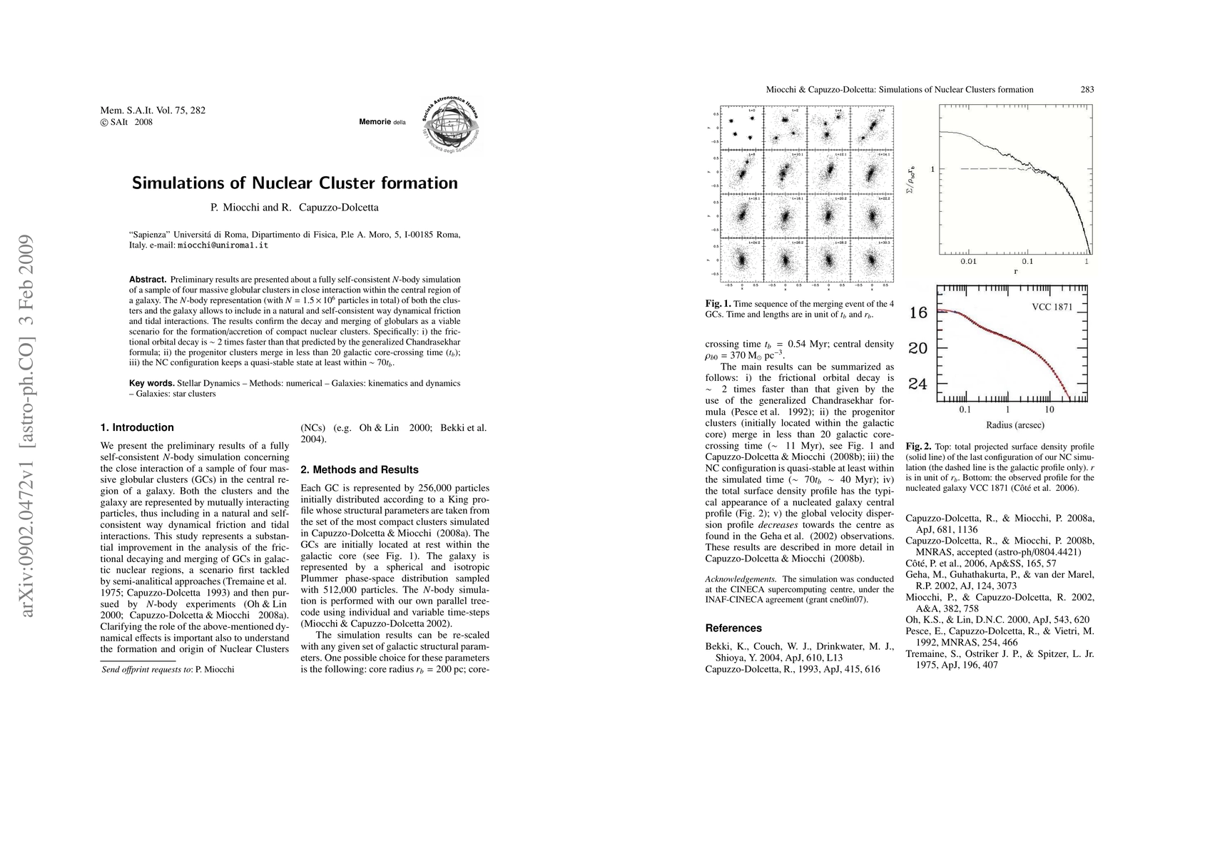 Preliminary results are presented about a fully self-consistent N-body simulation of a sample of four massive globular clusters in close interaction within the central region of a galaxy. The N-body representation (with N=1.5x10^6 particles in total) of both the clusters and the galaxy allows to include in a natural and self-consistent way dynamical friction and tidal interactions. The results confirm the decay and merging of globulars as a viable scenario for the formation/accretion of compact nuclear clusters. Specifically: i) the frictional orbital decay is about 2 times faster than that predicted by the generalized Chandrasekhar formula; ii) the progenitor clusters merge in less than 20 galactic core-crossing time; iii) the NC configuration keeps a quasi-stable state at least within 70 galactic core-crossing times.