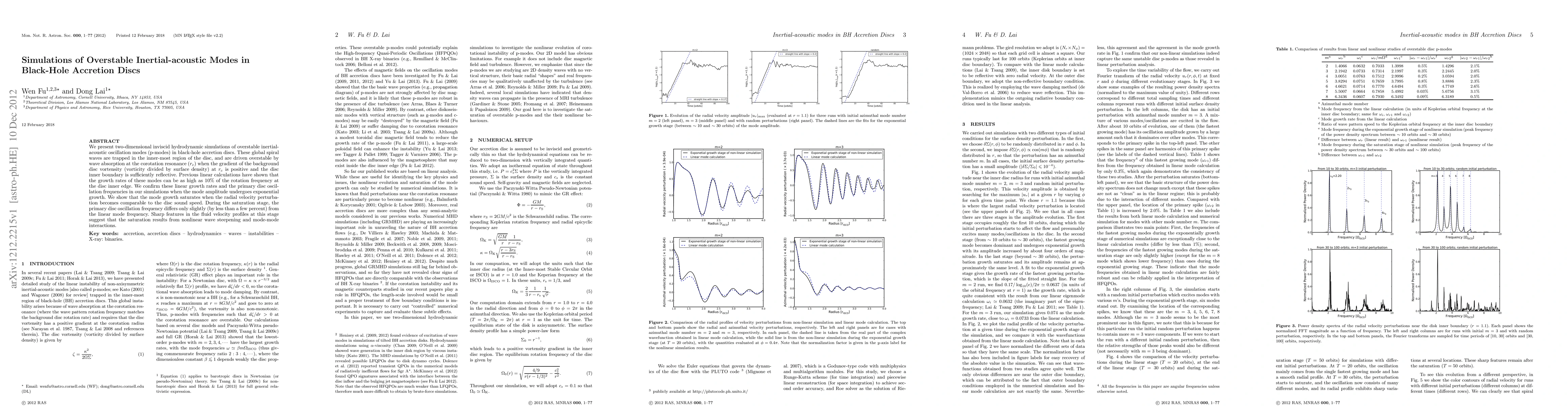 This paper presents simulations of overstable inertial-acoustic modes in black-hole accretion discs, confirming high growth rates and primary oscillation frequencies. The mode growth saturates when radial velocity perturbations reach the disc sound speed, with saturation attributed to nonlinear wave steepening and interactions.