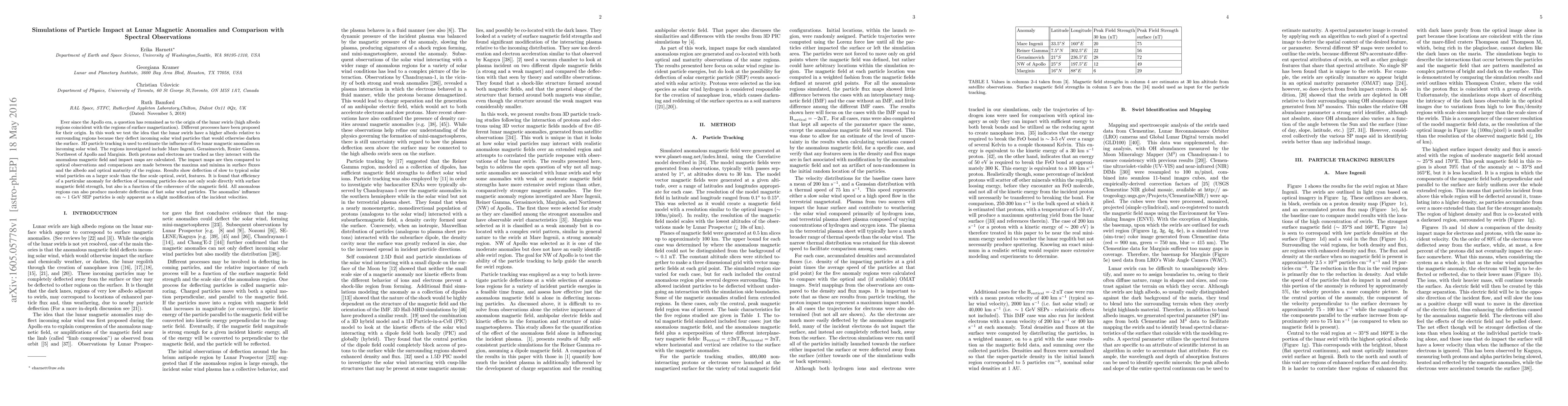 Ever since the Apollo era, a question has remained as to the origin of the lunar swirls (high albedo regions coincident with the regions of surface magnetization). Different processes have been proposed for their origin. In this work we test the idea that the lunar swirls have a higher albedo relative to surrounding regions because they deflect incoming solar wind particles that would otherwise darken the surface. 3D particle tracking is used to estimate the influence of five lunar magnetic anomalies on incoming solar wind. The regions investigated include Mare Ingenii, Gerasimovich, Renier Gamma, Northwest of Apollo and Marginis. Both protons and electrons are tracked as they interact with the anomalous magnetic field and impact maps are calculated. The impact maps are then compared to optical observations and comparisons are made between the maxima and minima in surface fluxes and the albedo and optical maturity of the regions. Results show deflection of slow to typical solar wind particles on a larger scale than the fine scale optical, swirl, features. It is found that efficiency of a particular anomaly for deflection of incoming particles does not only scale directly with surface magnetic field strength, but also is a function of the coherence of the magnetic field. All anomalous regions can also produce moderate deflection of fast solar wind particles. The anomalies' influence on ~ 1 GeV SEP particles is only apparent as a slight modification of the incident velocities.