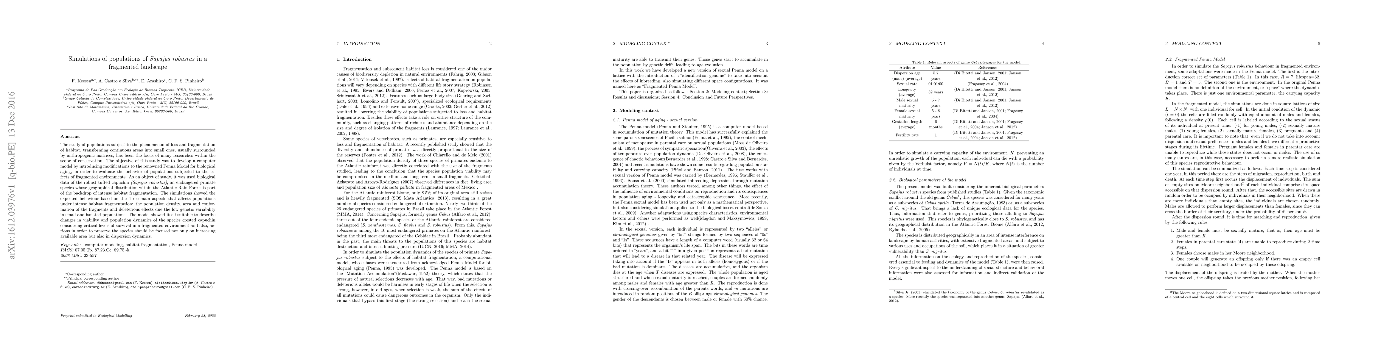 This research developed a computer model based on the Penna Model to study the impact of habitat fragmentation on the endangered robust tufted capuchin (Sapajus robustus). Simulations revealed that population density, fragment area and shape, and low genetic variability in small, isolated populations significantly affect species viability. The model suggests conservation efforts should focus on both increasing habitat area and improving dispersal dynamics.