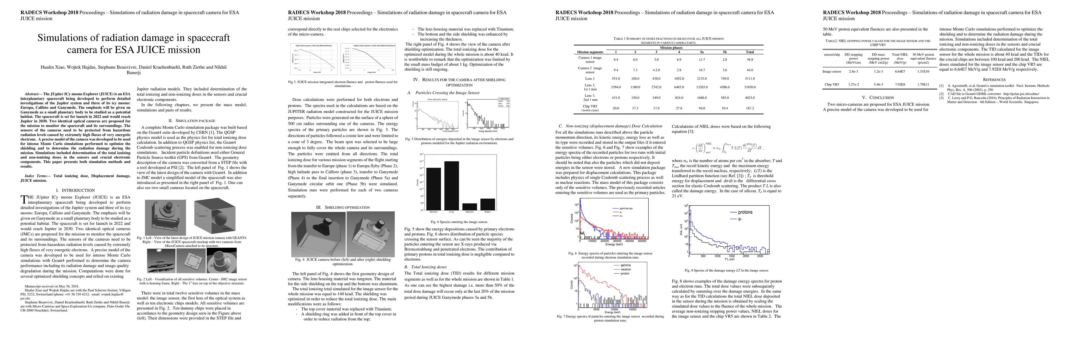 This paper details Monte Carlo simulations to assess the radiation damage to optical cameras on the ESA JUICE mission, focusing on shielding optimization. Results include total ionizing and non-ionizing doses for the sensors and electronic components, crucial for mission success.