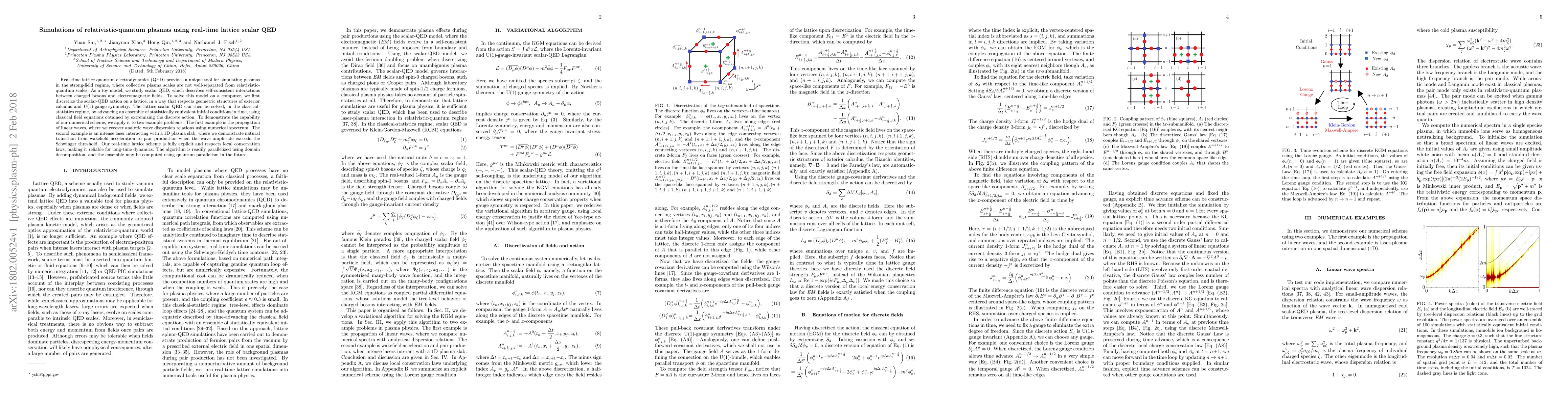This paper presents a real-time lattice simulation method for relativistic-quantum plasmas using discretized scalar QED, demonstrating its application in wave propagation and laser-plasma interactions, showcasing the transition from wakefield acceleration to pair production. The method respects gauge symmetry and conservation laws, and is parallelizable for efficient computation.