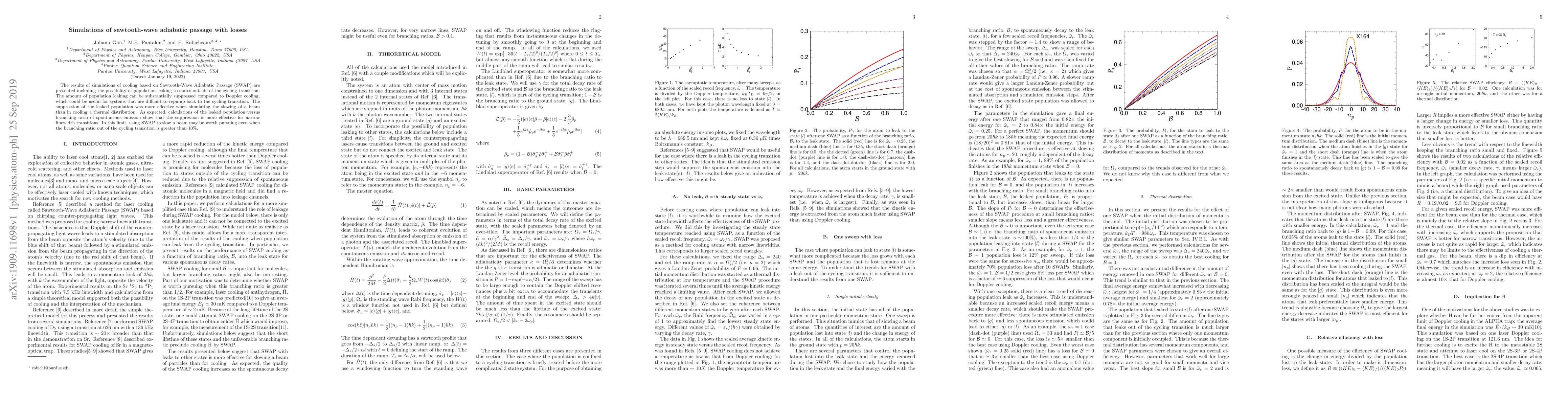 This paper simulates Sawtooth-Wave Adiabatic Passage (SWAP) cooling, showing that it can substantially suppress population leakage compared to Doppler cooling, especially for narrow linewidth transitions and beam slowing scenarios. The effectiveness of SWAP is noted even when the branching ratio is greater than 10%.
