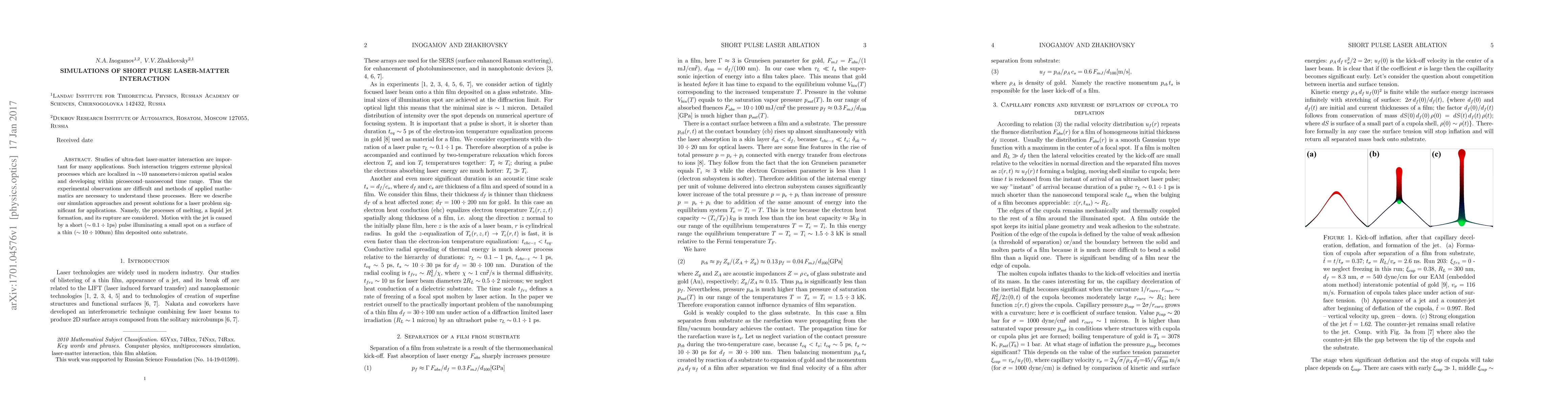 Studies of ultra-fast laser-matter interaction are important for many applications. Such interaction triggers extreme physical processes which are localized in the range from $\sim 10$ nanometers to micron spatial scales and developing within picosecond$-$nanosecond time range. Thus the experimental observations are difficult and methods of applied mathematics are necessary to understand these processes. Here we describe our simulation approaches and present solutions for a laser problem significant for applications. Namely, the processes of melting, a liquid jet formation, and its rupture are considered. Motion with the jet is caused by a short $\sim 0.1-1$ ps pulse illuminating a small spot on a surface of a thin $\sim 10-100$ nm film deposited onto substrate.