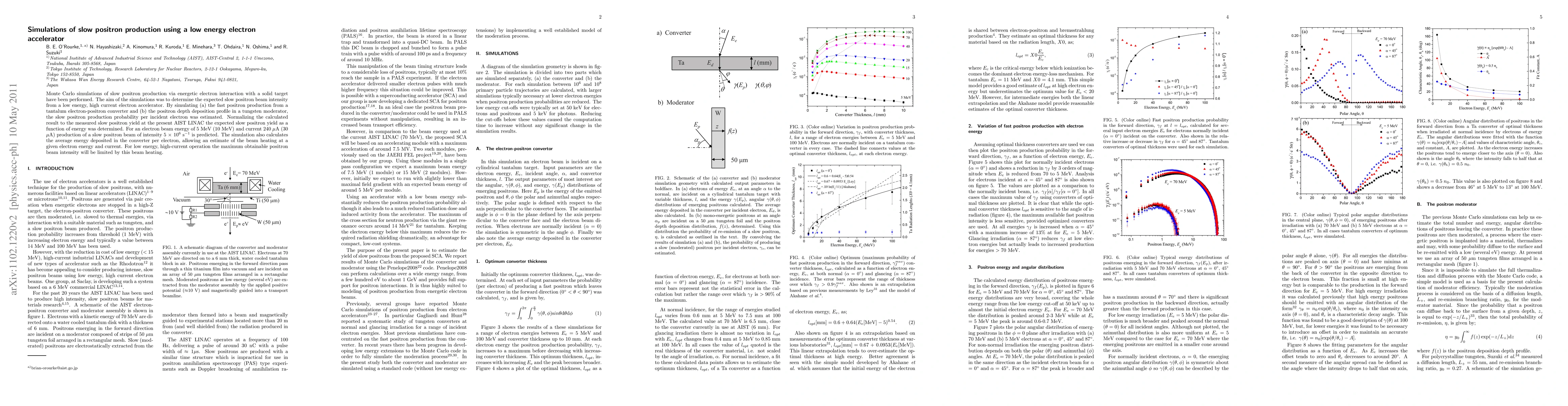 Research simulates slow positron production using a low energy electron accelerator, predicting high positron beam intensity for specific conditions.