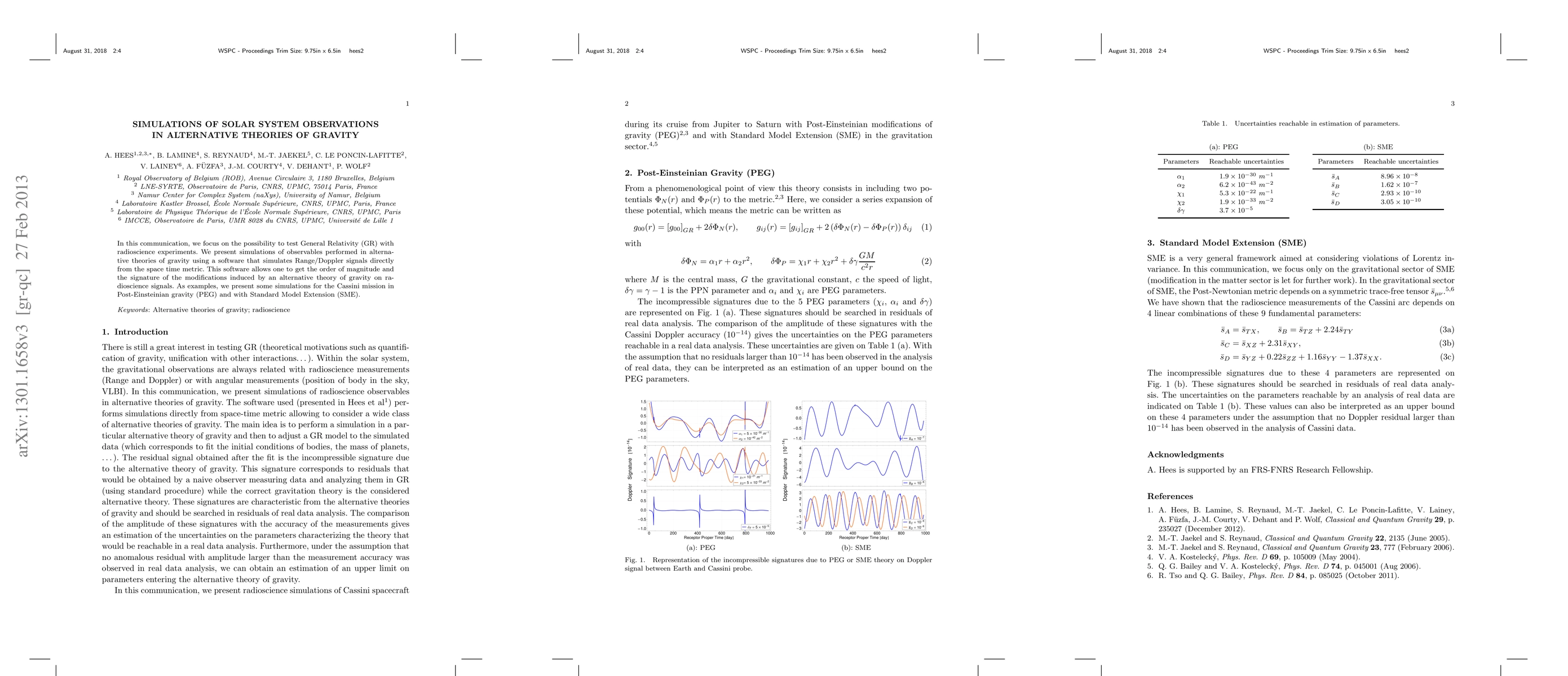 In this communication, we focus on the possibility to test General Relativity (GR) with radioscience experiments. We present simulations of observables performed in alternative theories of gravity using a software that simulates Range/Doppler signals directly from the space time metric. This software allows one to get the order of magnitude and the signature of the modifications induced by an alternative theory of gravity on radioscience signals. As examples, we present some simulations for the Cassini mission in Post-Einsteinian gravity (PEG) and with Standard Model Extension (SME).