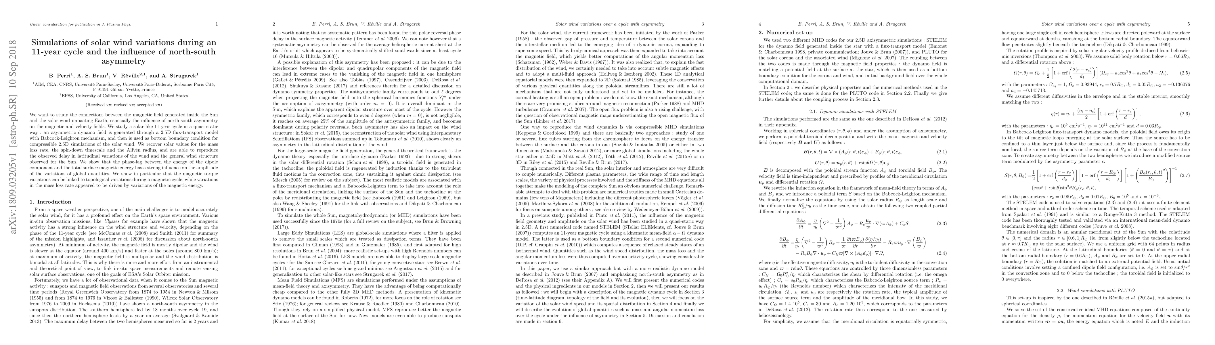 This paper simulates solar wind variations over an 11-year solar cycle, focusing on the impact of north-south asymmetry in the Sun's magnetic field. The study reveals that the phase lag between dipole energy and total surface magnetic energy significantly affects the amplitude of solar wind variations, linking magnetic torque variations to topological changes in the magnetic cycle.