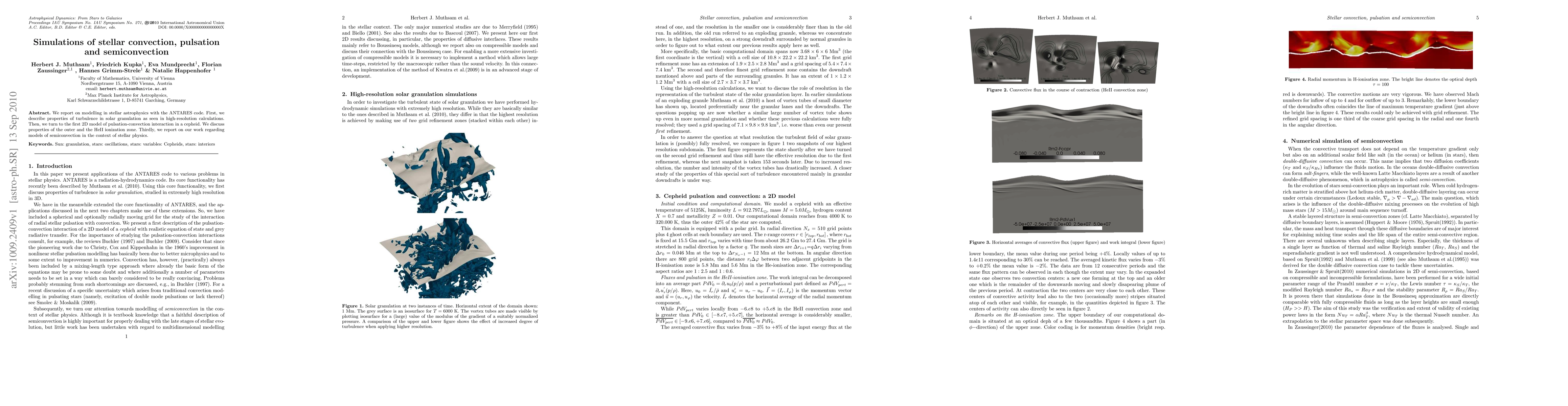 This paper uses the ANTARES code to model stellar phenomena, detailing turbulence in solar granulation, the interaction of pulsation and convection in a Cepheid star, and the properties of semiconvection in stellar physics. It focuses on the HEII ionization zone and the effects of semiconvection.