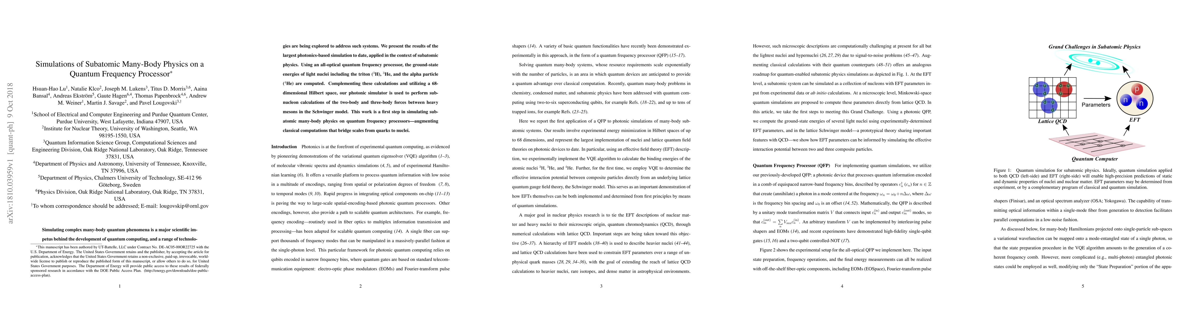 Simulating complex many-body quantum phenomena is a major scientific impetus behind the development of quantum computing, and a range of technologies are being explored to address such systems. We present the results of the largest photonics-based simulation to date, applied in the context of subatomic physics. Using an all-optical quantum frequency processor, the ground-state energies of light nuclei including the triton ($^3$H), $^{3}$He, and the alpha particle ($^{4}$He) are computed. Complementing these calculations and utilizing a 68-dimensional Hilbert space, our photonic simulator is used to perform sub-nucleon calculations of the two-body and three-body forces between heavy mesons in the Schwinger model. This work is a first step in simulating subatomic many-body physics on quantum frequency processors---augmenting classical computations that bridge scales from quarks to nuclei.