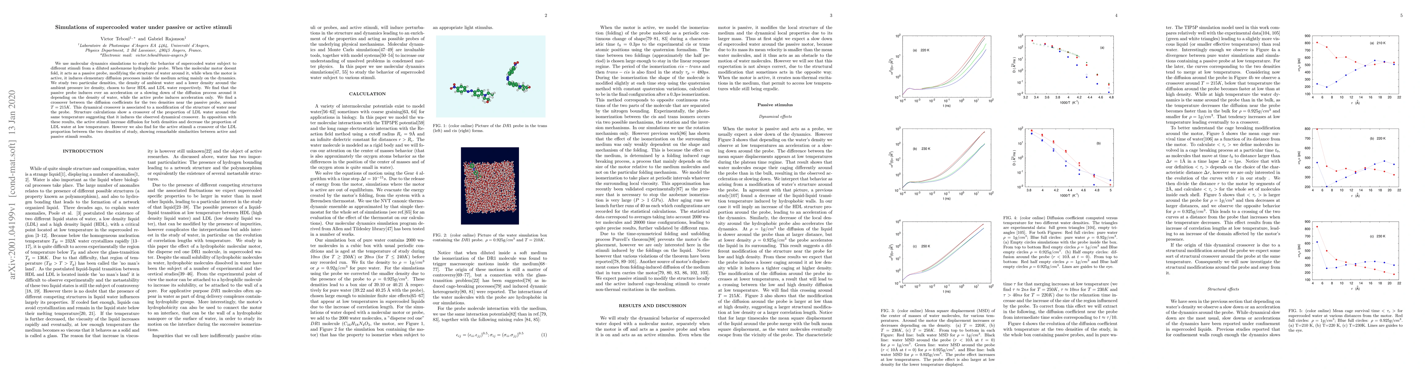 We use molecular dynamics simulations to study the behavior of supercooled water subject to different stimuli from a diluted azobenzene hydrophobic probe. When the molecular motor does not fold, it acts as a passive probe, modifying the structure of water around it, while when the motor is active, it induces elementary diffusion processes inside the medium acting mainly on the dynamics. We study two particular densities, the density of ambient water and a lower density around the ambient pressure ice density, chosen to favor high density liquid and low density liquid (LDL) water, respectively. We find that the passive probe induces ever an acceleration or a slowing down of the diffusion process around it depending on the density of water, while the active probe induces acceleration only. We find a crossover between the diffusion coefficients for the two densities near the passive probe, around T = 215 K. This dynamical crossover is associated with a modification of the structure of water near the probe. Structure calculations show a crossover of the proportion of LDL water around the same temperature, suggesting that it induces the observed dynamical crossover. In opposition with these results, the active stimuli increase diffusion for both densities and decrease the proportion of LDL water at low temperatures. However, we also find for the active stimuli a crossover of the LDL proportion between the two densities of study, showing remarkable similarities between active and passive stimulus results.