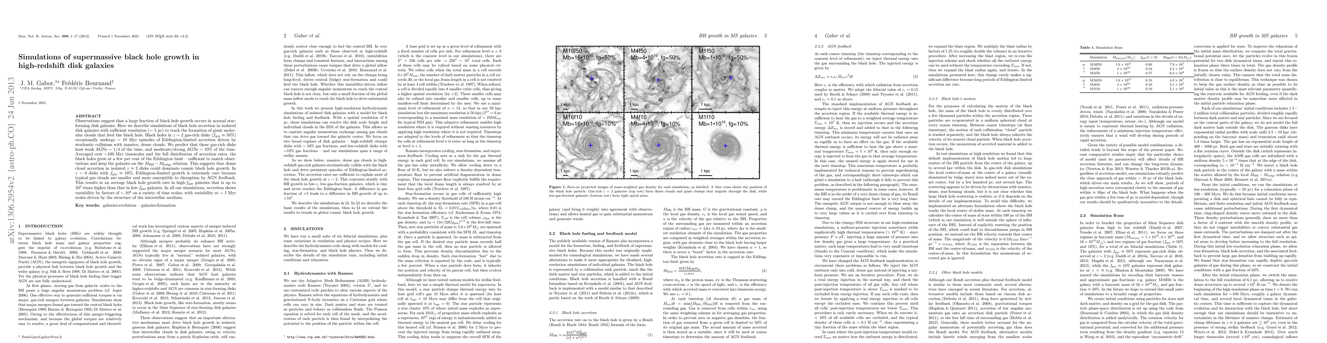 This paper simulates supermassive black hole growth in high-redshift disk galaxies, finding that dense gas clouds drive episodic Eddington-limited accretion in gas-rich z=2 disks, leading to weak, moderate, or strong AGN activity. In contrast, low-gas z=0 disks show rare Eddington-limited growth due to AGN feedback.