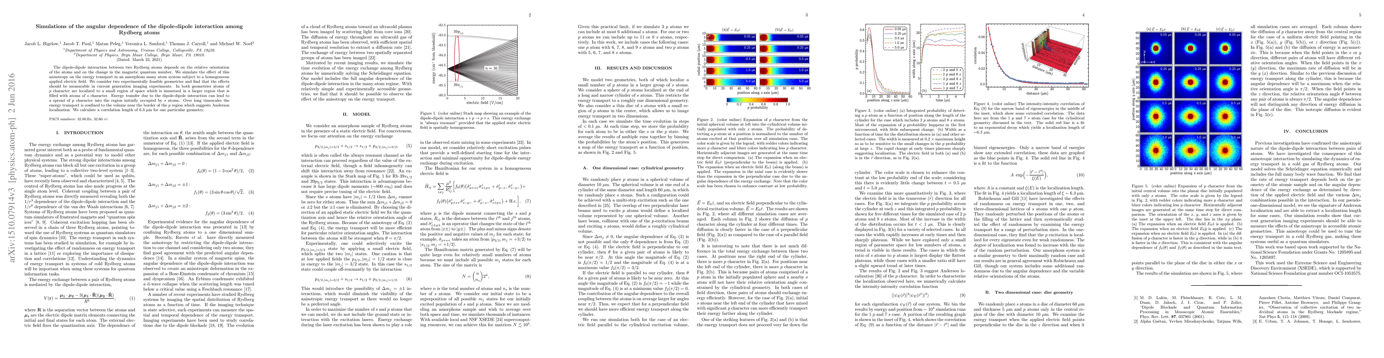 This paper simulates the angular dependence of dipole-dipole interactions among Rydberg atoms, focusing on energy transport in an amorphous system under an electric field. The study suggests measurable effects in current imaging experiments and finds evidence of Anderson localization with a calculated correlation length of 6.3~$\mu$m.