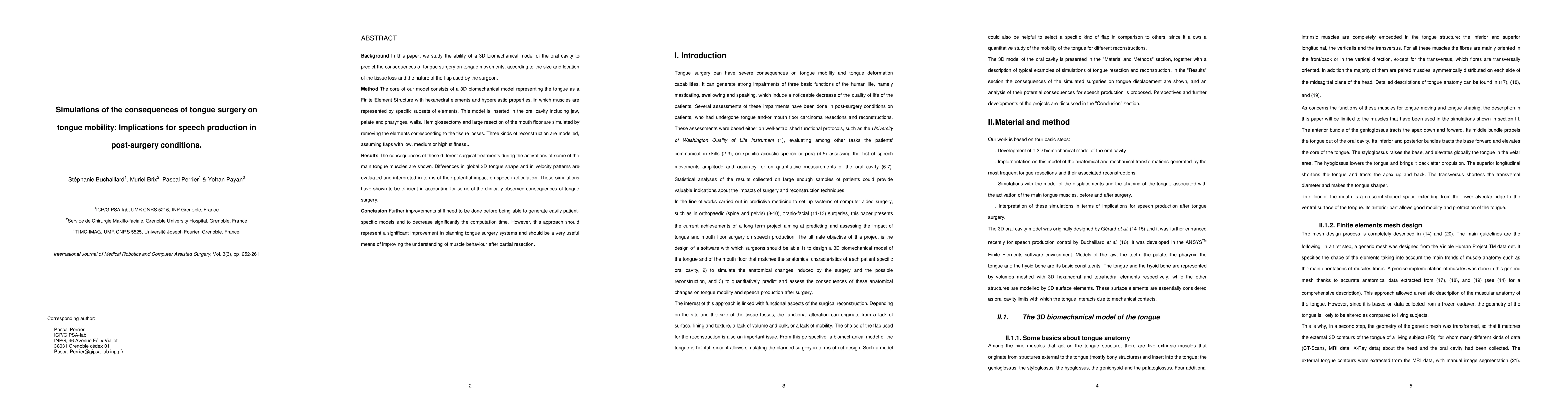 This study uses a 3D biomechanical model to simulate the impact of tongue surgery on speech production, finding that different reconstruction methods affect tongue mobility and shape during speech.