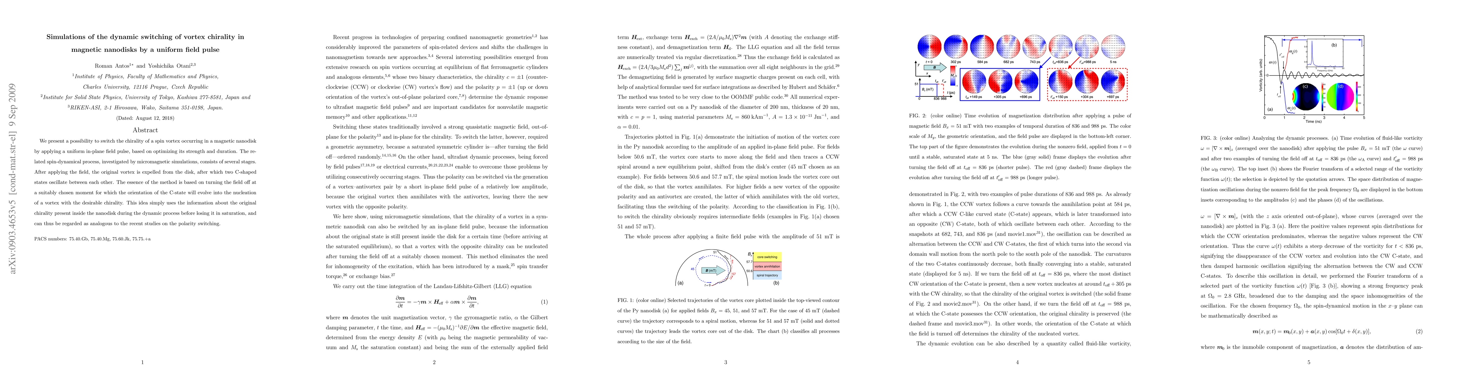 This paper explores the dynamic switching of a spin vortex's chirality in magnetic nanodisks via a uniform in-plane field pulse, revealing a multi-stage spin-dynamical process. The method involves expelling the original vortex and inducing oscillations between C-shaped states, ultimately nucleating a vortex with the desired chirality by timing the field's removal.
