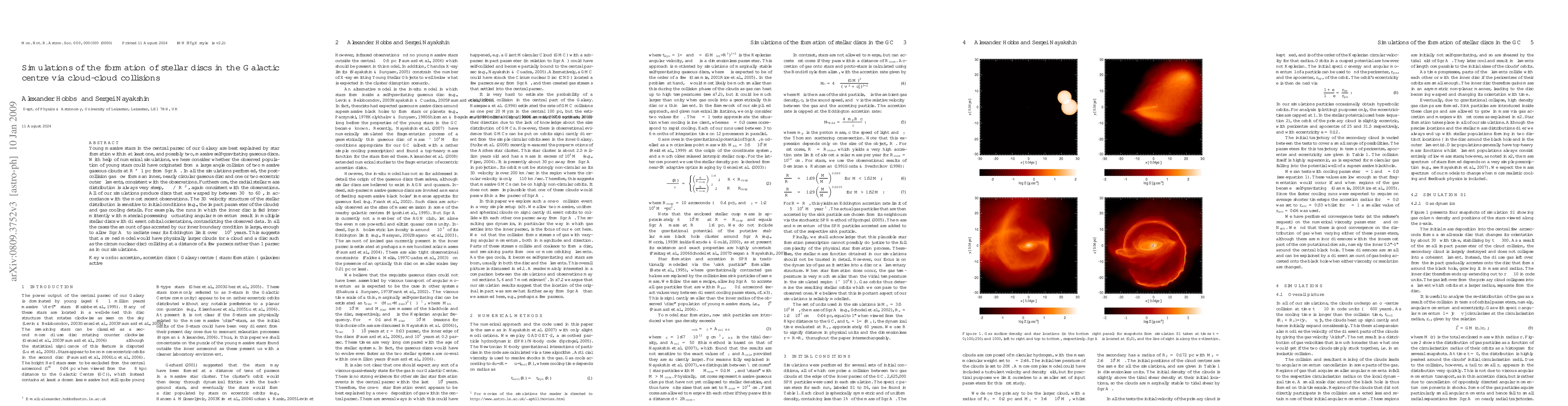 Young massive stars in the central parsec of our Galaxy are best explained by star formation within at least one, and possibly two, massive self-gravitating gaseous discs. With help of numerical simulations, we here consider whether the observed population of young stars could have originated from a large angle collision of two massive gaseous clouds at R approx. 1 parsec from Sgr A*. In all the simulations performed, the post-collision gas flow forms an inner, nearly circular gaseous disc and one or two eccentric outer filaments, consistent with the observations. Furthermore, the radial stellar mass distribution is always very steep, Sigma proportional to R^-2, again consistent with the observations. All of our simulations produce discs that are warped by between 30 to 60 degrees, in accordance with the most recent observations. The 3D velocity structure of the stellar distribution is sensitive to initial conditions (e.g., the impact parameter of the clouds) and gas cooling details. For example, the runs in which the inner disc is fed intermittently with material possessing fluctuating angular momentum result in multiple stellar discs with different orbital orientations, contradicting the observed data. In all the cases the amount of gas accreted by our inner boundary condition is large, enough to allow Sgr A* to radiate near its Eddington limit over approx. 10^5 years. This suggests that a refined model would have physically larger clouds (or a cloud and a disc such as the circumnuclear disc) colliding at a distance of a few parsecs rather than 1 parsec as in our simulations.