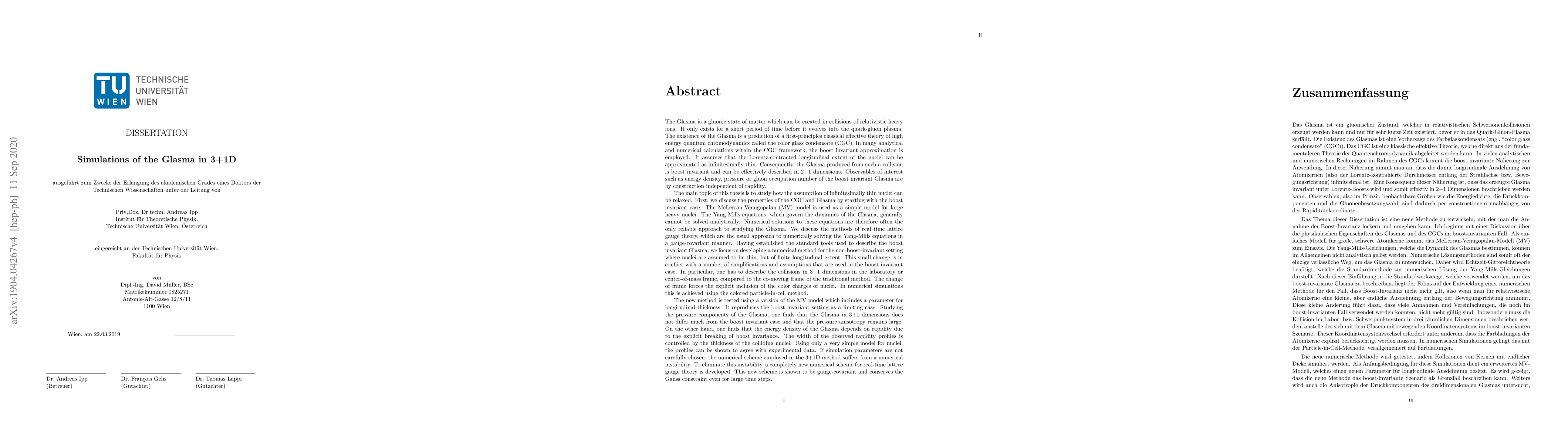 The Glasma is a gluonic state of matter which can be created in collisions of relativistic heavy ions and is a precursor to the quark-gluon plasma. The existence of this state is a prediction of the color glass condensate (CGC) effective theory. In many applications of the CGC framework, the boost invariant approximation is employed. It assumes that the longitudinal extent of the nuclei can be approximated as infinitesimally thin. Consequently, the Glasma produced from such a collision is boost invariant and can be effectively described in 2+1D. Therefore, observables of the boost invariant Glasma are by construction independent of rapidity. The main goal of this thesis is to develop a numerical method for the non-boost-invariant setting where nuclei are assumed to be thin, but of finite longitudinal extent. This is in conflict with a number of simplifications that are used in the boost invariant case. In particular, one has to describe the collisions in 3+1D in the laboratory or center-of-mass frame. The change of frame forces the explicit inclusion of the color charges of nuclei. The new method is tested using an extension of the McLerran-Venugopalan model which includes a parameter for longitudinal thickness. It reproduces the boost invariant setting as a limiting case. Studying the pressure components of the Glasma, one finds the pressure anisotropy remains large. The energy density of the Glasma depends on rapidity due to the explicit breaking of boost invariance. The width of the observed rapidity profiles is controlled by the collision energy and can be shown to roughly agree with experimental data. Finally, a new numerical scheme for real-time lattice gauge theory is developed which provides higher numerical stability than the previous method. This new scheme is shown to be gauge-covariant and conserves the Gauss constraint even for large time steps.