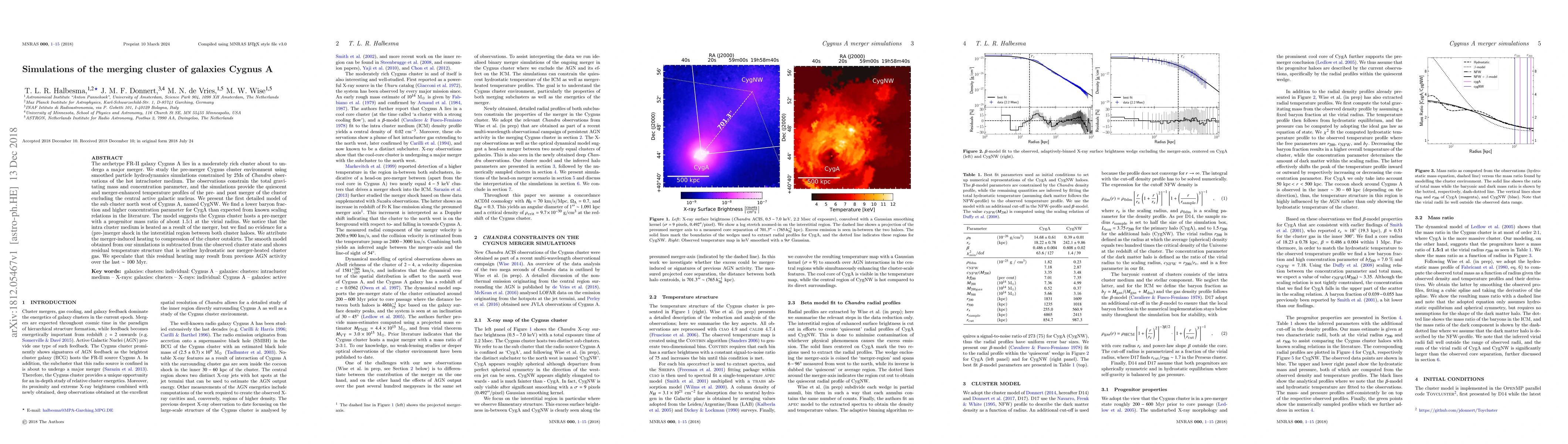 This paper uses hydrodynamics simulations to study the merging cluster of Cygnus A, revealing a lower baryon fraction and higher concentration parameter for Cygnus A. The simulations suggest a pre-merger with a mass ratio of 1.5:1 and indicate merger-induced heating without evidence of a merger shock, attributing the heating to compression of the cluster outskirts.
