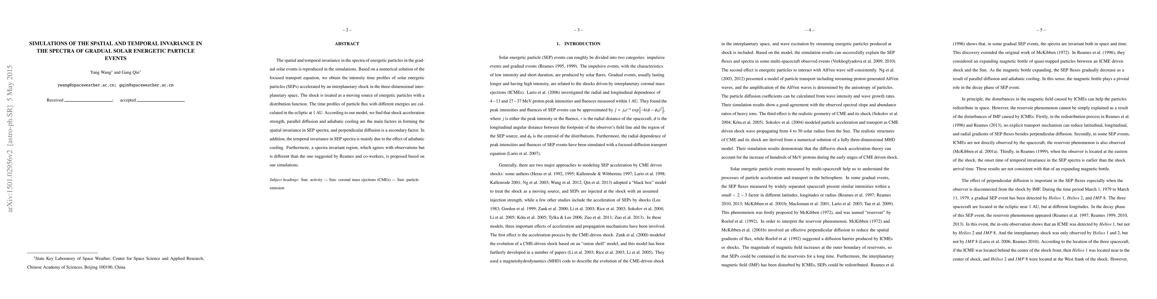This paper simulates the spatial and temporal invariance in the spectra of gradual solar energetic particle events using a numerical solution of the focused transport equation. The study identifies shock acceleration, parallel diffusion, and adiabatic cooling as primary factors for spatial invariance, while adiabatic cooling is key for temporal invariance.