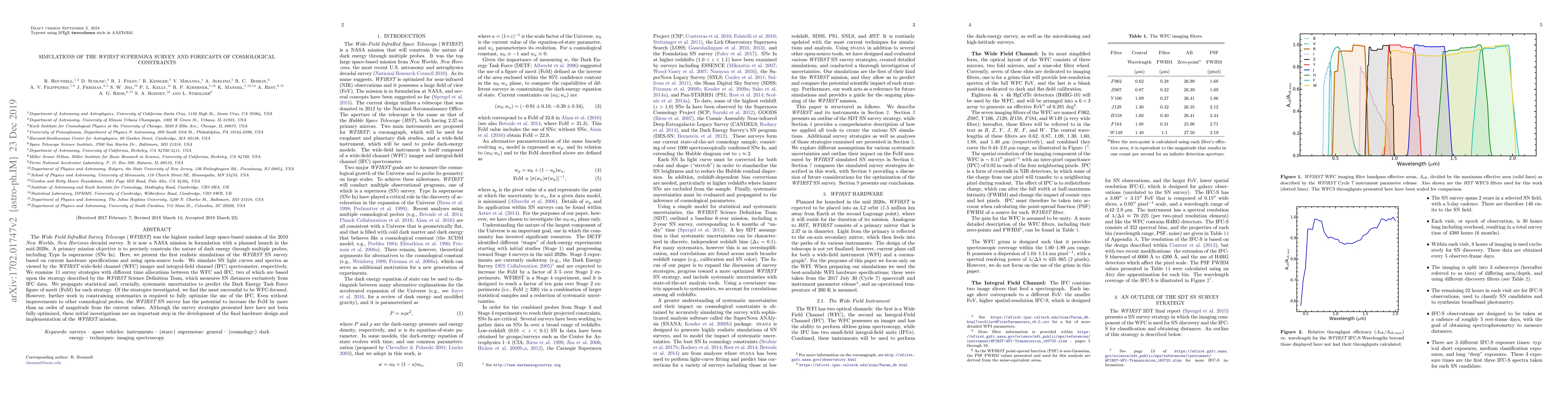 This paper presents simulations of the WFIRST supernova survey, predicting the mission's ability to constrain dark energy through Type Ia supernovae. The simulations suggest that WFC-focused strategies yield the most successful results, though improvements in systematics are needed to optimize the use of the IFC. The survey has the potential to significantly enhance current cosmological constraints.