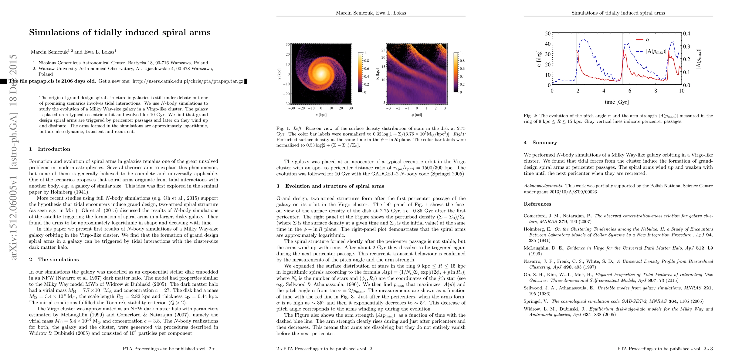 This paper uses N-body simulations to explore how tidal interactions in a Virgo-like cluster can induce grand design spiral arms in a Milky Way-sized galaxy. The study finds that these arms are triggered by pericenter passages and evolve into dynamic, transient, and recurrent structures over 10 Gyr.
