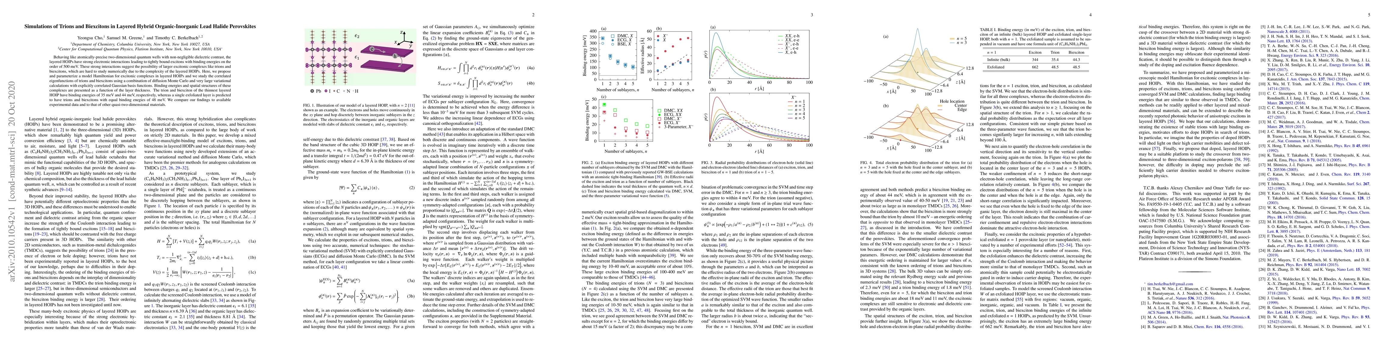 This paper proposes a model Hamiltonian to study trions and biexcitons in layered hybrid organic-inorganic lead halide perovskites, revealing their binding energies through advanced numerical simulations. The results show that trions and biexcitons in thin layers have binding energies of 35 meV and 44 meV, respectively, and compare well with experimental data.