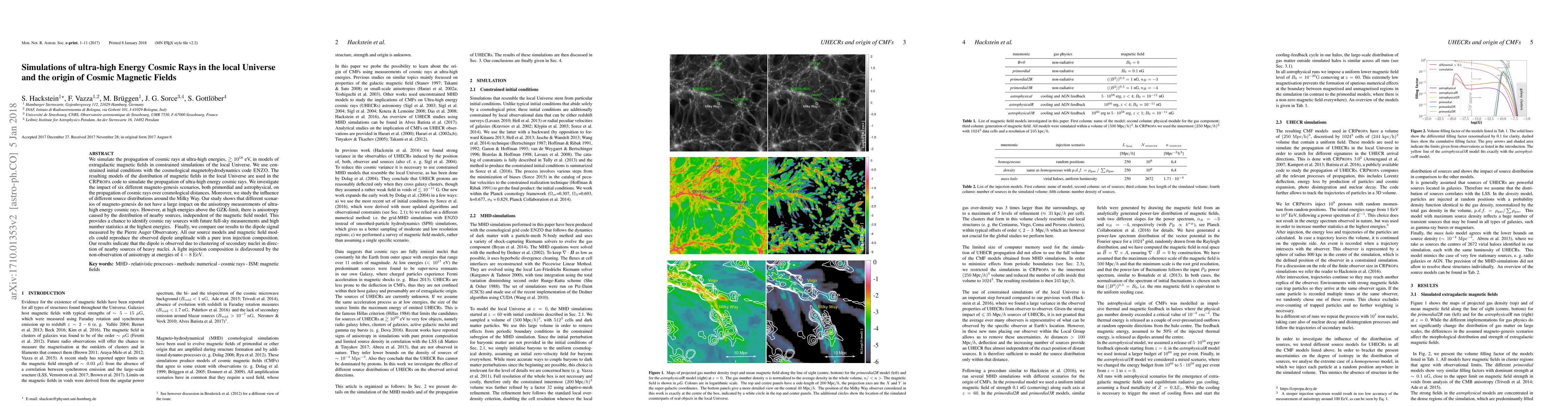 This paper simulates ultra-high energy cosmic rays' propagation in the local Universe using magnetohydrodynamics and cosmic ray propagation codes. It finds that while different magnetic field scenarios have minimal impact on cosmic ray anisotropy, nearby source distributions cause anisotropy above the GZK-limit, offering potential for source identification. The study also correlates the observed dipole signal with clustering of heavy nuclei from nearby sources.