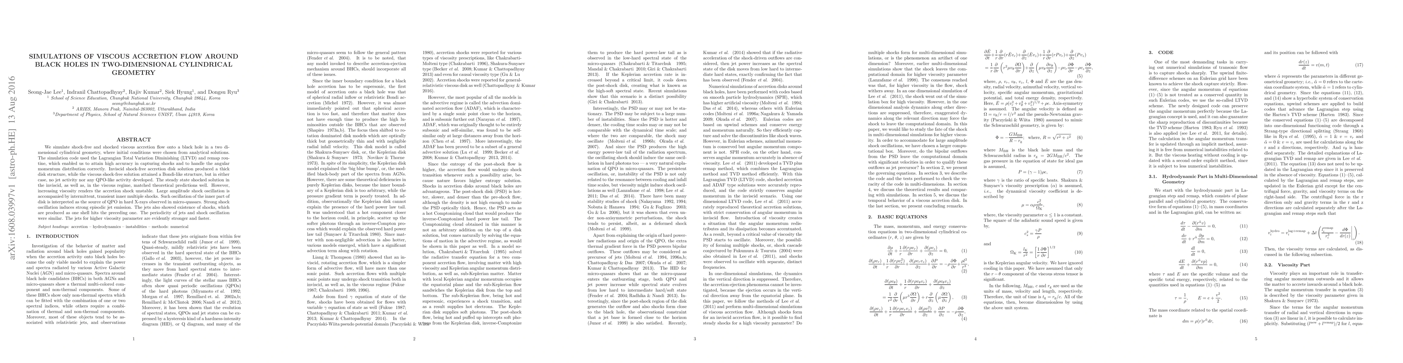 We simulate shock-free and shocked viscous accretion flow onto a black hole in a two dimensional cylindrical geometry, where initial conditions were chosen from analytical solutions. The simulation code used the Lagrangian Total Variation Diminishing (LTVD) and remap routine, which enabled us to attain high accuracy in capturing shocks and to handle the angular momentum distribution correctly. Inviscid shock-free accretion disk solution produced a thick disk structure, while the viscous shock-free solution attained a Bondi-like structure, but in either case, no jet activity nor any QPO-like activity developed. The steady state shocked solution in the inviscid, as well as, in the viscous regime, matched theoretical predictions well. However, increasing viscosity renders the accretion shock unstable. Large amplitude shock oscillation is accompanied by intermittent, transient inner multiple shocks. Such oscillation of the inner part of disk is interpreted as the source of QPO in hard X-rays observed in micro-quasars. Strong shock oscillation induces strong episodic jet emission. The jets also showed existence of shocks, which are produced as one shell hits the preceding one. The periodicity of jets and shock oscillation were similar. The jets for higher viscosity parameter are evidently stronger and faster.