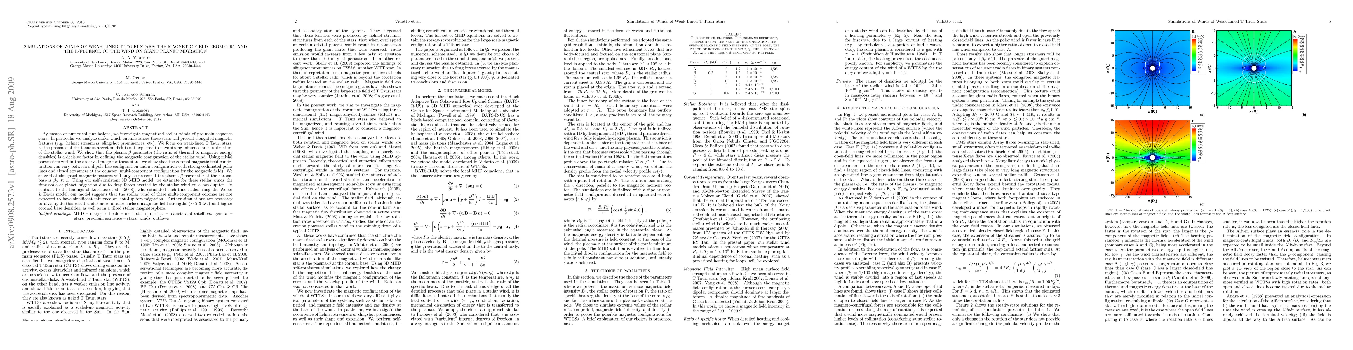 This paper uses numerical simulations to explore the magnetic field geometry of weak-lined T Tauri stars and its influence on giant planet migration. It finds that the plasma-beta parameter determines the magnetic configuration, with elongated features only present when beta is much less than 1. Contrary to previous models, the study suggests these stellar winds do not significantly affect hot-Jupiter migration.
