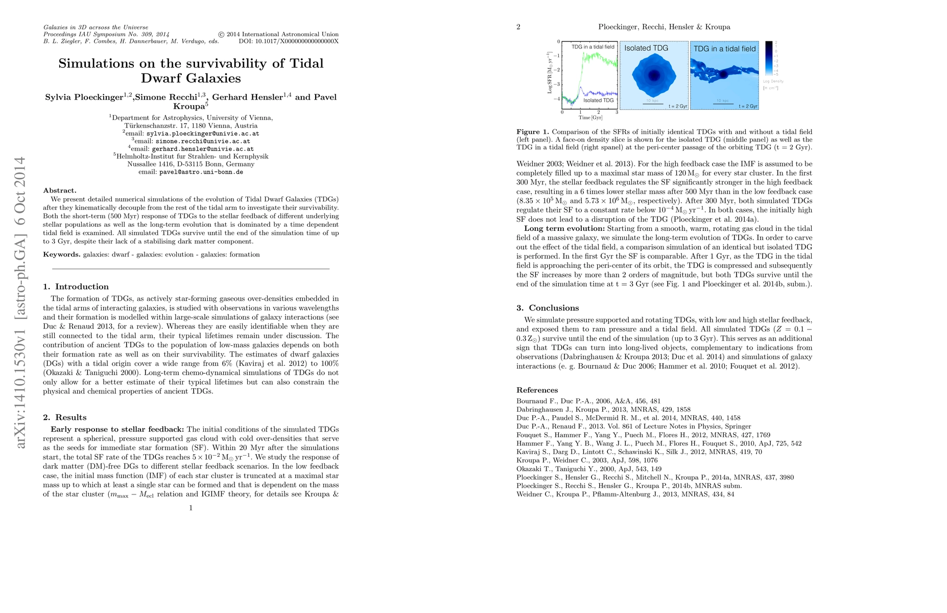 This paper presents numerical simulations showing the survivability of Tidal Dwarf Galaxies (TDGs) over timescales up to 3 Gyr, despite lacking a dark matter component, and explores the effects of stellar feedback and tidal forces on their evolution.