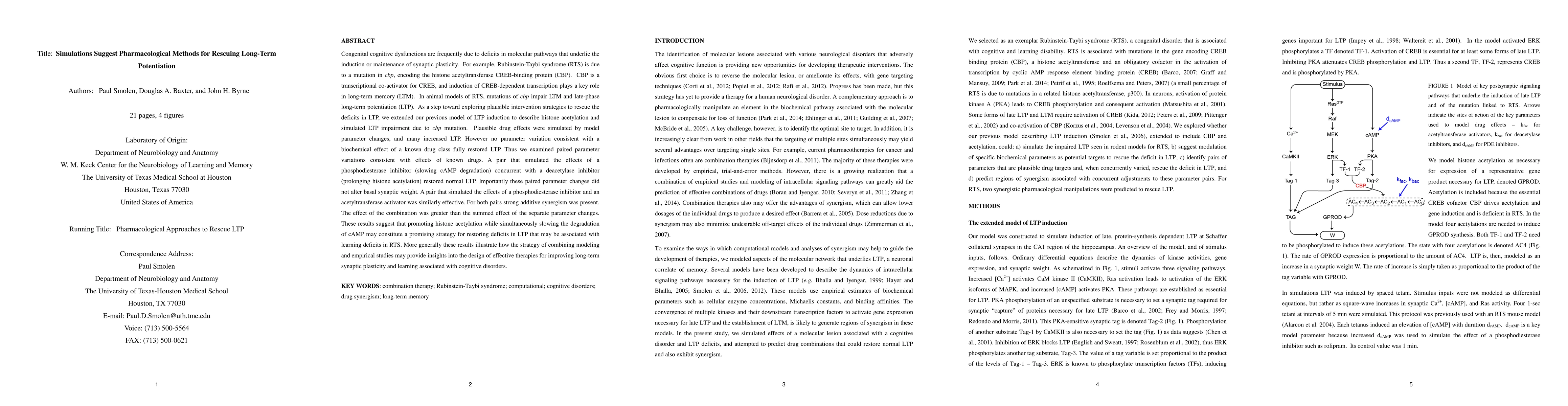 Congenital cognitive dysfunctions are frequently due to deficits in molecular pathways that underlie synaptic plasticity. For example, Rubinstein-Taybi syndrome (RTS) is due to a mutation in cbp, encoding the histone acetyltransferase CREB-binding protein (CBP). CBP is a transcriptional co-activator for CREB, and induction of CREB-dependent transcription plays a key role in long-term memory (LTM). In animal models of RTS, mutations of cbp impair LTM and late-phase long-term potentiation (LTP). To explore intervention strategies to rescue the deficits in LTP, we extended a previous model of LTP induction to describe histone acetylation and simulated LTP impairment due to cbp mutation. Plausible drug effects were simulated by parameter changes, and many increased LTP. However no parameter variation consistent with a biochemical effect of a known drug fully restored LTP. Thus we examined paired parameter variations. A pair that simulated the effects of a phosphodiesterase inhibitor (slowing cAMP degradation) concurrent with a deacetylase inhibitor (prolonging histone acetylation) restored LTP. Importantly these paired parameter changes did not alter basal synaptic weight. A pair that simulated a phosphodiesterase inhibitor and an acetyltransferase activator was similarly effective. For both pairs strong additive synergism was present. These results suggest that promoting histone acetylation while simultaneously slowing the degradation of cAMP may constitute a promising strategy for restoring deficits in LTP that may be associated with learning deficits in RTS. More generally these results illustrate the strategy of combining modeling and empirical studies may help design effective therapies for improving long-term synaptic plasticity and learning in cognitive disorders.