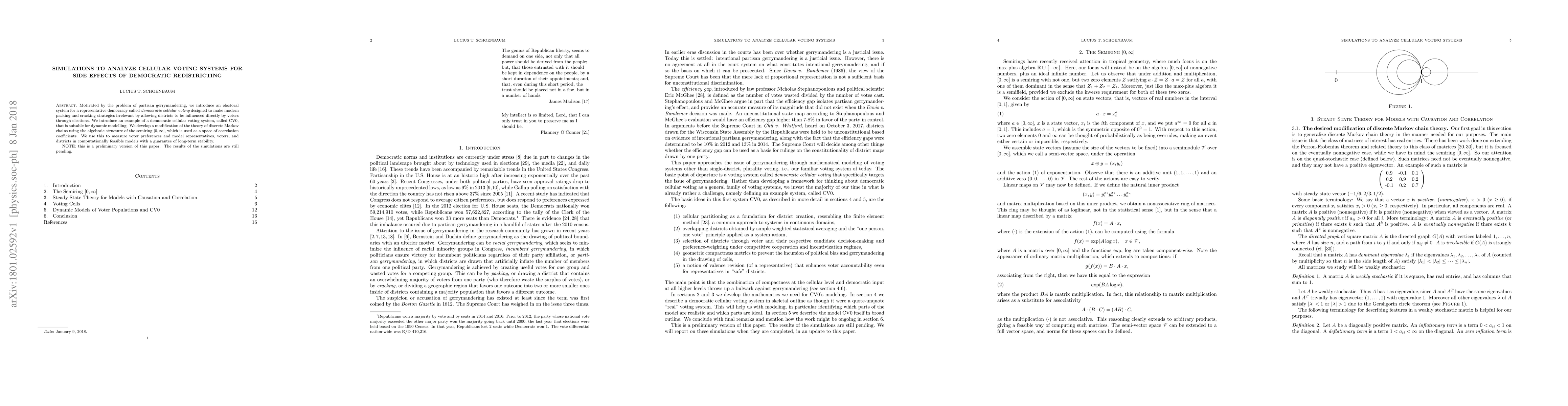 Motivated by the problem of partisan gerrymandering, we introduce an electoral system for a representative democracy called democratic cellular voting, designed to make modern packing and cracking strategies irrelevant by allowing districts to be influenced directly by voters through elections. We introduce an example of a democratic cellular voting system, called CV0, that is suitable for dynamic modelling. We develop a modification of the theory of discrete Markov chains using the algebraic structure of the semiring $[0,\infty]$, which is used as a space of correlation coefficients. We use this to measure voter preferences and model representatives, voters, and districts in computationally feasible models with a guarantee of long-term stability.