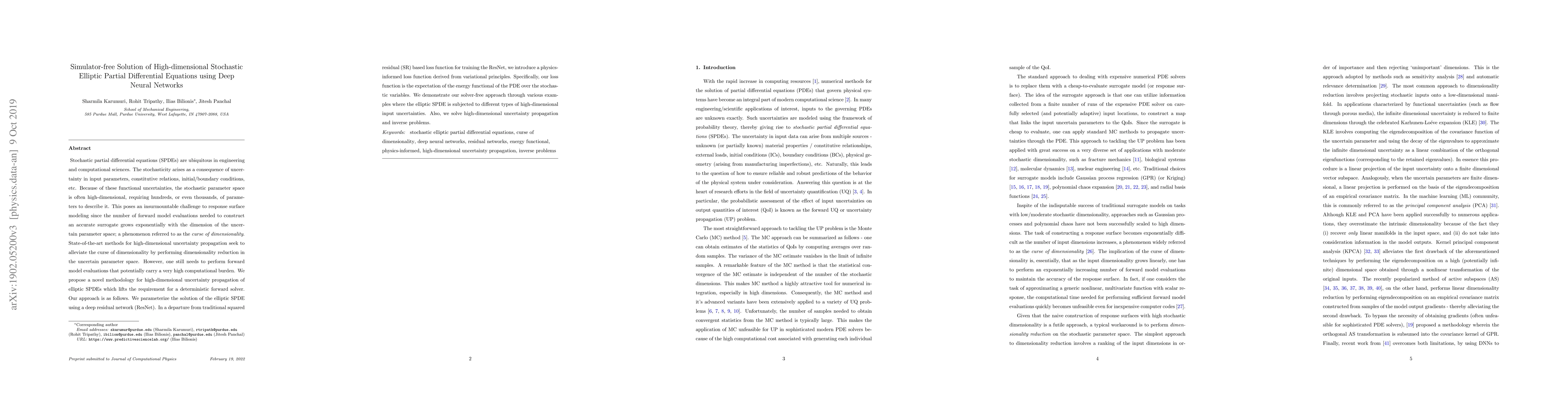 This research paper proposes a novel approach to solving high-dimensional stochastic elliptic partial differential equations using deep neural networks, eliminating the need for explicit forward model evaluations.