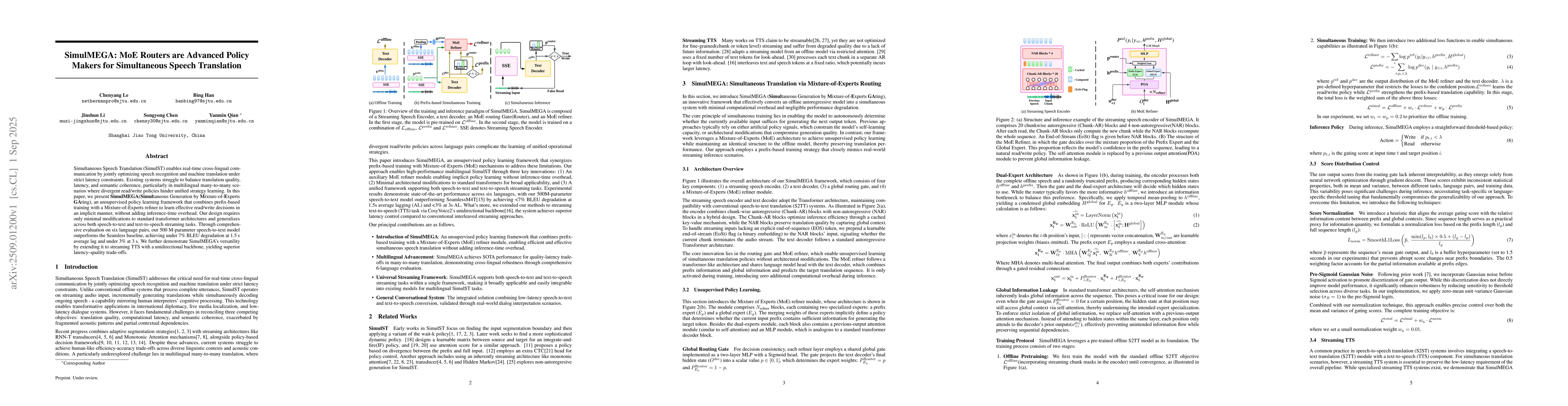 Simultaneous Speech Translation (SimulST) enables real-time cross-lingual communication by jointly optimizing speech recognition and machine translation under strict latency constraints. Existing systems struggle to balance translation quality, latency, and semantic coherence, particularly in multilingual many-to-many scenarios where divergent read and write policies hinder unified strategy learning. In this paper, we present SimulMEGA (Simultaneous Generation by Mixture-of-Experts Gating), an unsupervised policy learning framework that combines prefix-based training with a Mixture-of-Experts refiner to learn effective read and write decisions in an implicit manner, without adding inference-time overhead. Our design requires only minimal modifications to standard transformer architectures and generalizes across both speech-to-text and text-to-speech streaming tasks. Through comprehensive evaluation on six language pairs, our 500M parameter speech-to-text model outperforms the Seamless baseline, achieving under 7 percent BLEU degradation at 1.5 seconds average lag and under 3 percent at 3 seconds. We further demonstrate the versatility of SimulMEGA by extending it to streaming TTS with a unidirectional backbone, yielding superior latency quality tradeoffs.