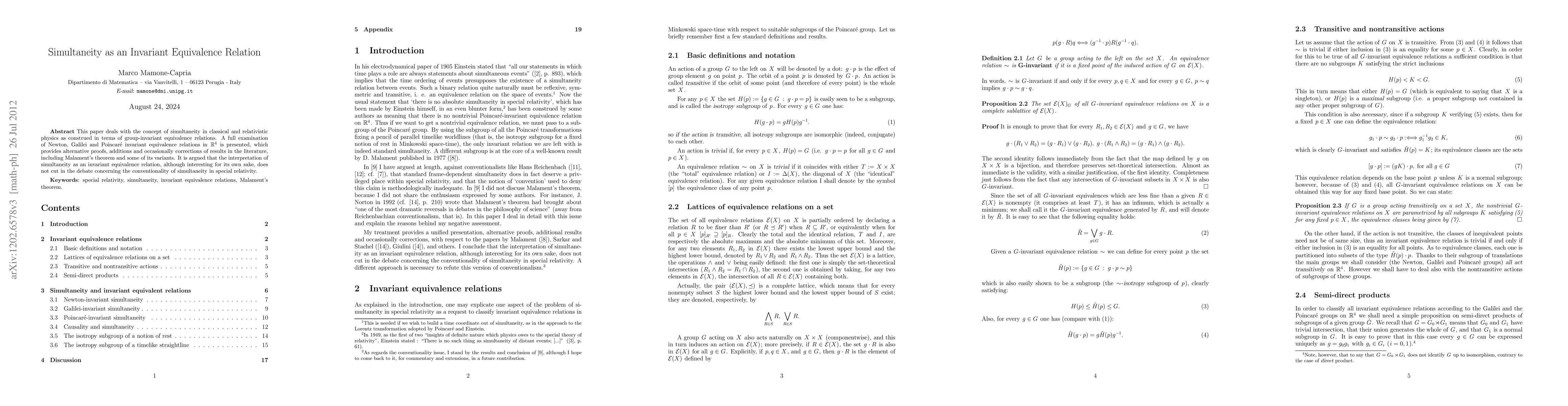 This paper explores simultaneity through group-invariant equivalence relations in classical and relativistic physics, examining Newton, Galilei, and Poincaré invariants, and providing new insights on Malament's theorem, though it concludes that this interpretation does not resolve debates on the conventionality of simultaneity in special relativity.