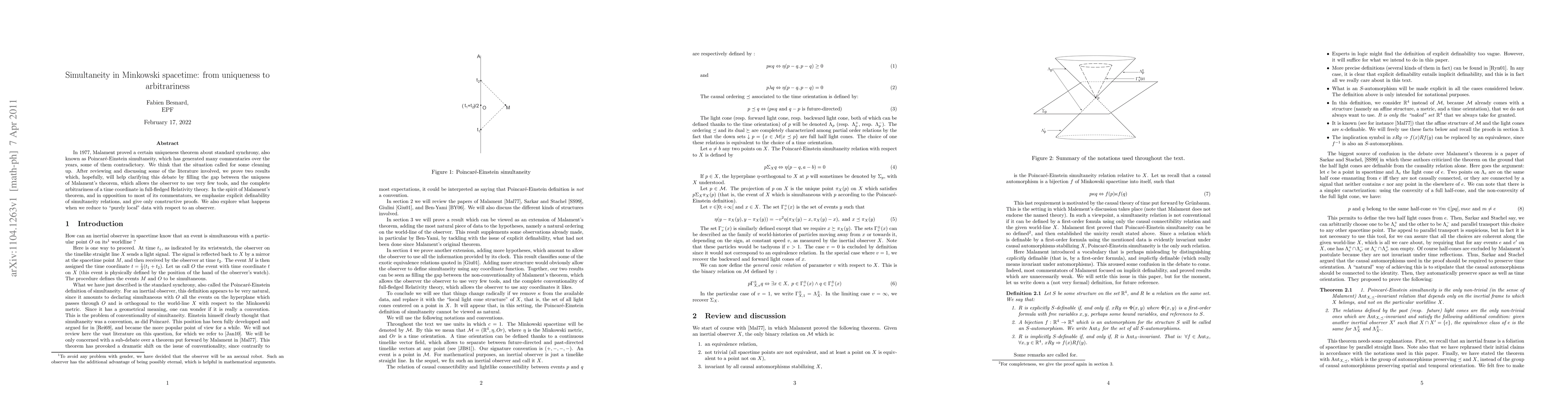 This paper clarifies the debate on simultaneity in Minkowski spacetime by proving two results that bridge the uniqueness of Malament's 1977 theorem and the arbitrariness of time coordinates in full Relativity theory, emphasizing explicit definability and constructive proofs.