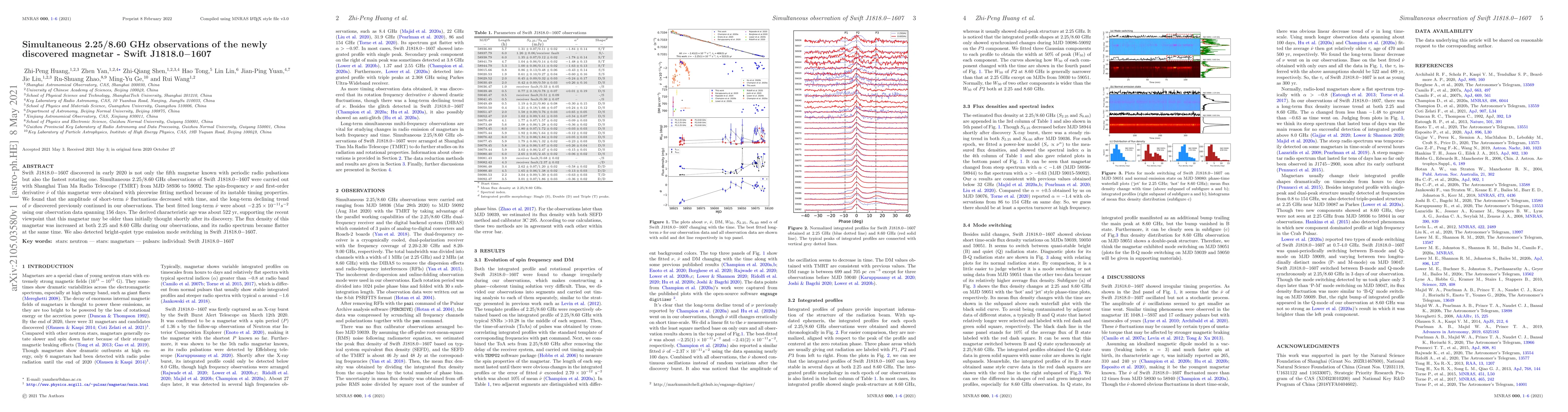 Swift J1818.0-1607 discovered in early 2020 is not only the fifth magnetar known with periodic radio pulsations but also the fastest rotating one. Simultaneous 2.25 and 8.60 GHz observations of Swift J1818.0-1607 were carried out with Shanghai Tian Ma Radio Telescope (TMRT) from MJD 58936 to 59092. The spin-frequency $\nu$ and first-order derivative $\dot\nu$ of this magnetar were obtained with piecewise fitting method because of its instable timing properties. We found that the amplitude of short-term $\dot\nu$ fluctuations decreased with time, and the long-term declining trend of $\nu$ discovered previously continued in our observations. The best fitted long-term $\dot\nu$ were about $-2.25 \times 10^{-11}~s^{-2}$ using our observation data spanning 156 days. The derived characteristic age was about 522 yr, supporting the recent viewpoint that this magnetar may be older than initially thought shortly after its discovery. The flux density of this magnetar was increased at both 2.25 and 8.60 GHz during our observations, and its radio spectrum became flatter at the same time. We also detected bright-quiet type emission mode switching in Swift J1818.0-1607.
