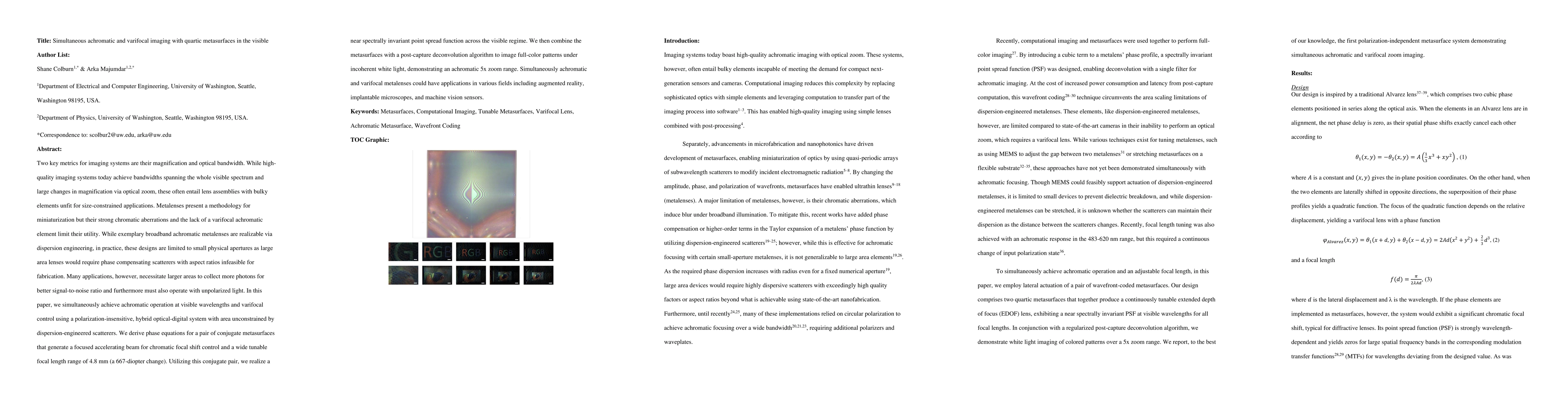 This paper presents a novel quartic metasurface design that achieves simultaneous achromatic and varifocal imaging across the visible spectrum, addressing the limitations of traditional metalenses. The proposed hybrid optical-digital system enables a wide tunable focal length range and achromatic 5x zoom, with potential applications in augmented reality, implantable microscopes, and machine vision.