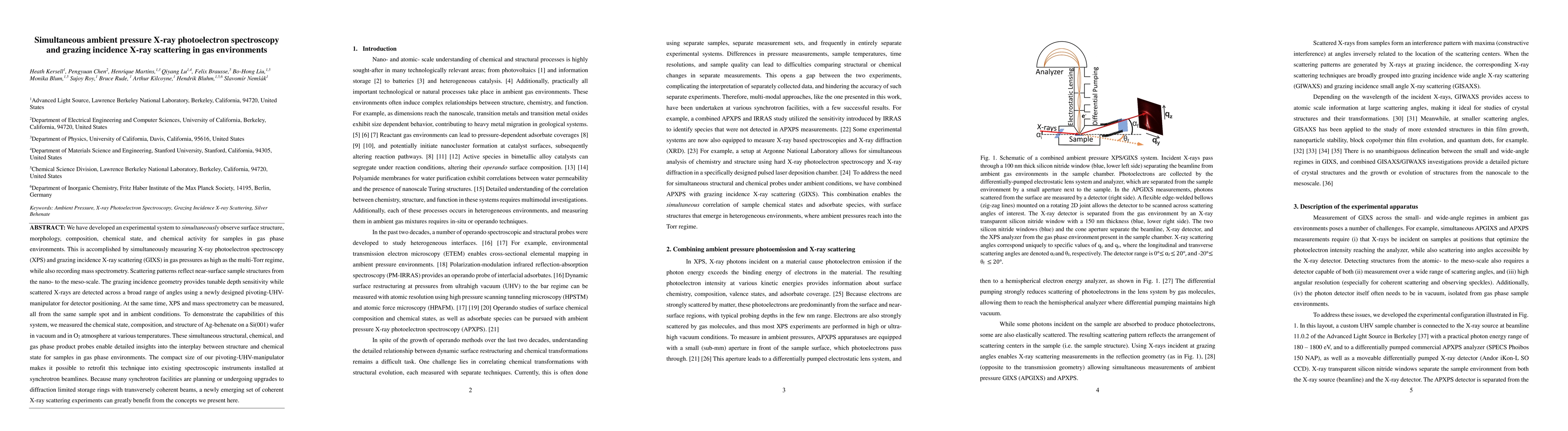 We have developed an experimental system to simultaneously observe surface structure, morphology, composition, chemical state, and chemical activity for samples in gas phase environments. This is accomplished by simultaneously measuring X-ray photoelectron spectroscopy (XPS) and grazing incidence X-ray scattering (GIXS) in gas pressures as high as the multi-Torr regime, while also recording mass spectrometry. Scattering patterns reflect near-surface sample structures from the nano- to the meso-scale. The grazing incidence geometry provides tunable depth sensitivity while scattered X-rays are detected across a broad range of angles using a newly designed pivoting-UHV-manipulator for detector positioning. At the same time, XPS and mass spectrometry can be measured, all from the same sample spot and in ambient conditions. To demonstrate the capabilities of this system, we measured the chemical state, composition, and structure of Ag-behenate on a Si(001) wafer in vacuum and in O$_2$ atmosphere at various temperatures. These simultaneous structural, chemical, and gas phase product probes enable detailed insights into the interplay between structure and chemical state for samples in gas phase environments. The compact size of our pivoting-UHV-manipulator makes it possible to retrofit this technique into existing spectroscopic instruments installed at synchrotron beamlines. Because many synchrotron facilities are planning or undergoing upgrades to diffraction limited storage rings with transversely coherent beams, a newly emerging set of coherent X-ray scattering experiments can greatly benefit from the concepts we present here.