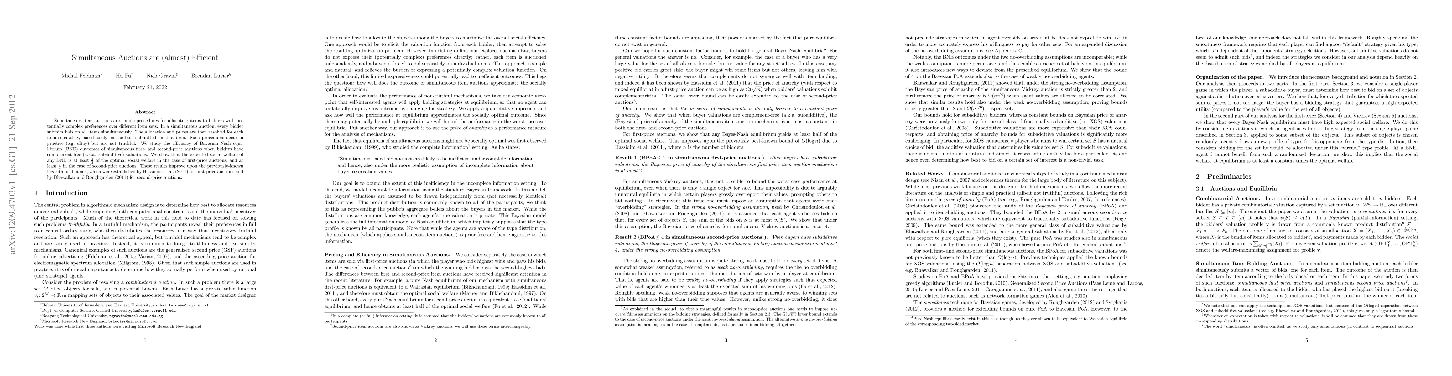 This paper examines the efficiency of Bayesian Nash equilibrium outcomes in simultaneous first- and second-price auctions, showing that they achieve at least 1/2 and 1/4 of the optimal social welfare, respectively, for bidders with complement-free valuations, improving upon previous logarithmic bounds.