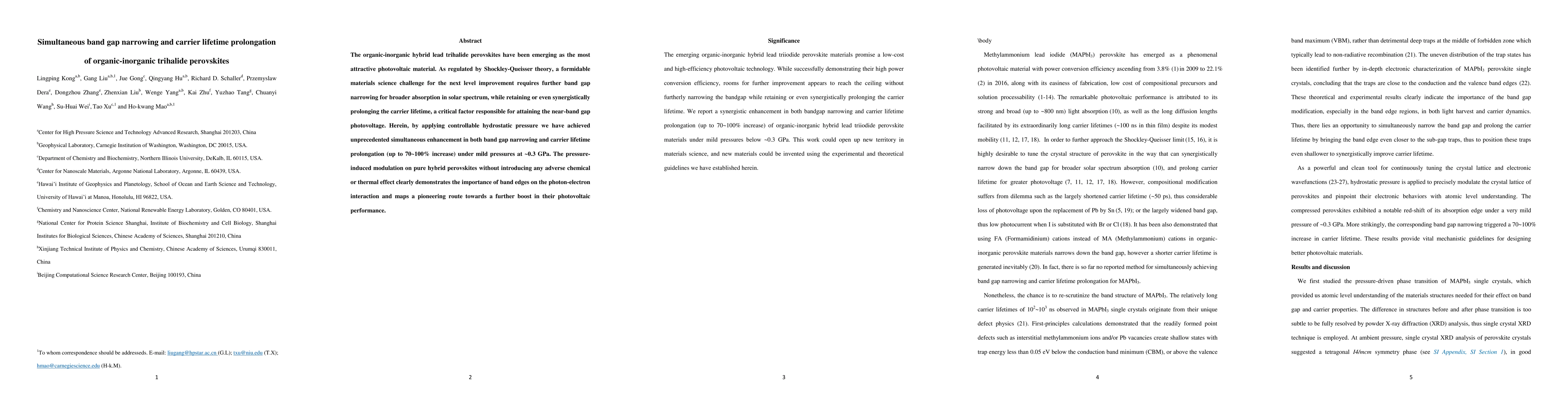 The organic-inorganic hybrid lead trihalide perovskites have been emerging as the most attractive photovoltaic material. As regulated by Shockley-Queisser theory, a formidable materials science challenge for the next level improvement requires further band gap narrowing for broader absorption in solar spectrum, while retaining or even synergistically prolonging the carrier lifetime, a critical factor responsible for attaining the near-band gap photovoltage. Herein, by applying controllable hydrostatic pressure we have achieved unprecedented simultaneous enhancement in both band gap narrowing and carrier lifetime prolongation (up to 70~100% increase) under mild pressures at ~0.3 GPa. The pressure-induced modulation on pure hybrid perovskites without introducing any adverse chemical or thermal effect clearly demonstrates the importance of band edges on the photon-electron interaction and maps a pioneering route towards a further boost in their photovoltaic performance.