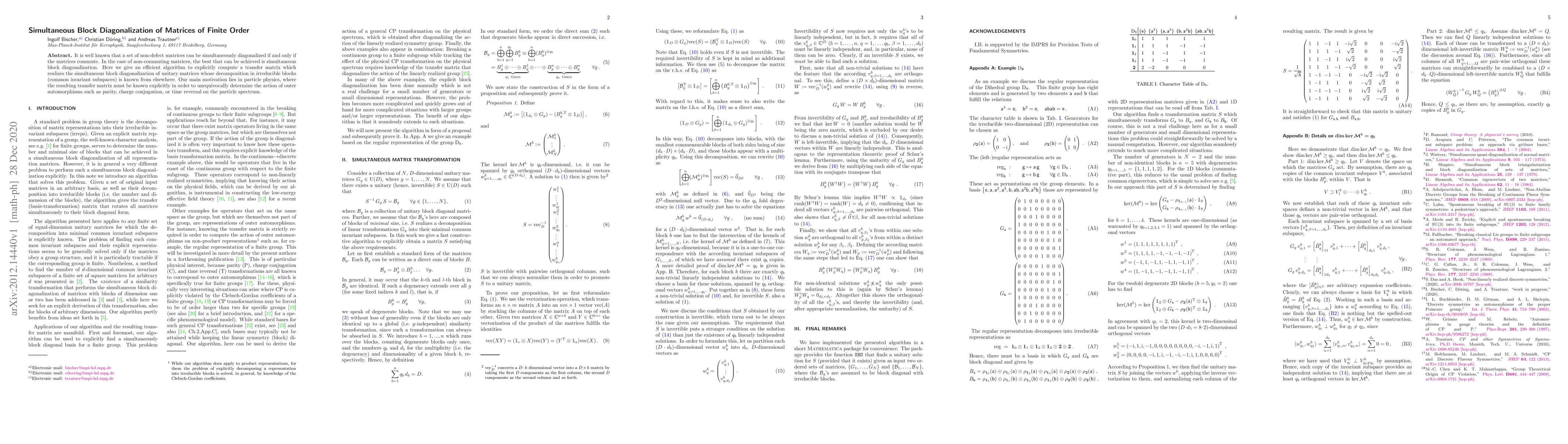 Researchers developed an efficient algorithm to compute a transfer matrix for simultaneous block diagonalization of unitary matrices, enabling the determination of outer automorphisms in particle physics.