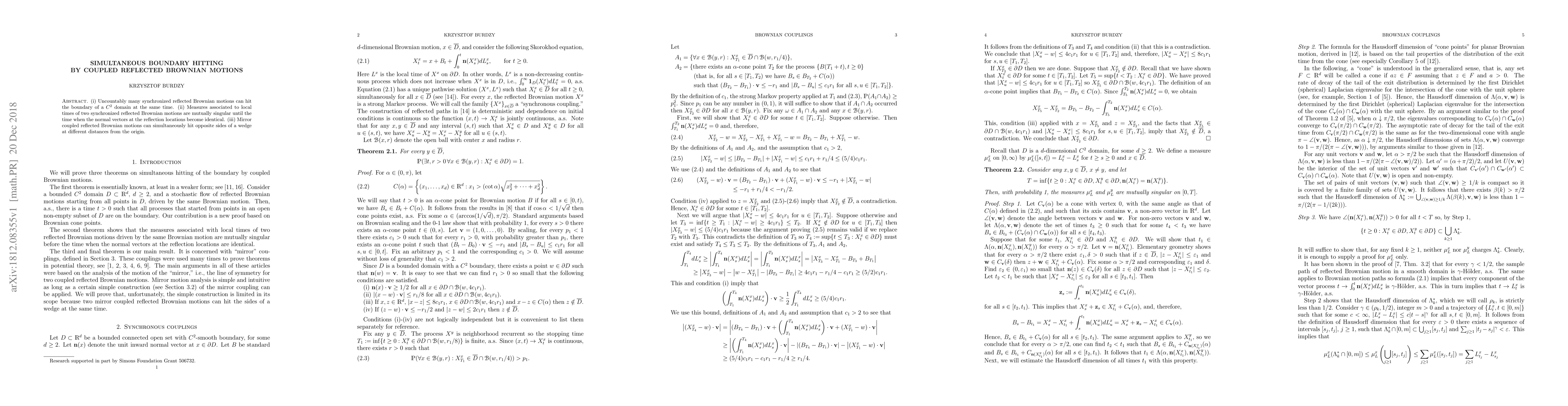 This paper explores the simultaneous boundary hitting phenomena in coupled reflected Brownian motions, showing that multiple synchronized motions can hit a $C^2$ domain boundary at the same time. It also reveals that the measures associated with local times of two such motions are mutually singular until the normal vectors at their reflection points align.