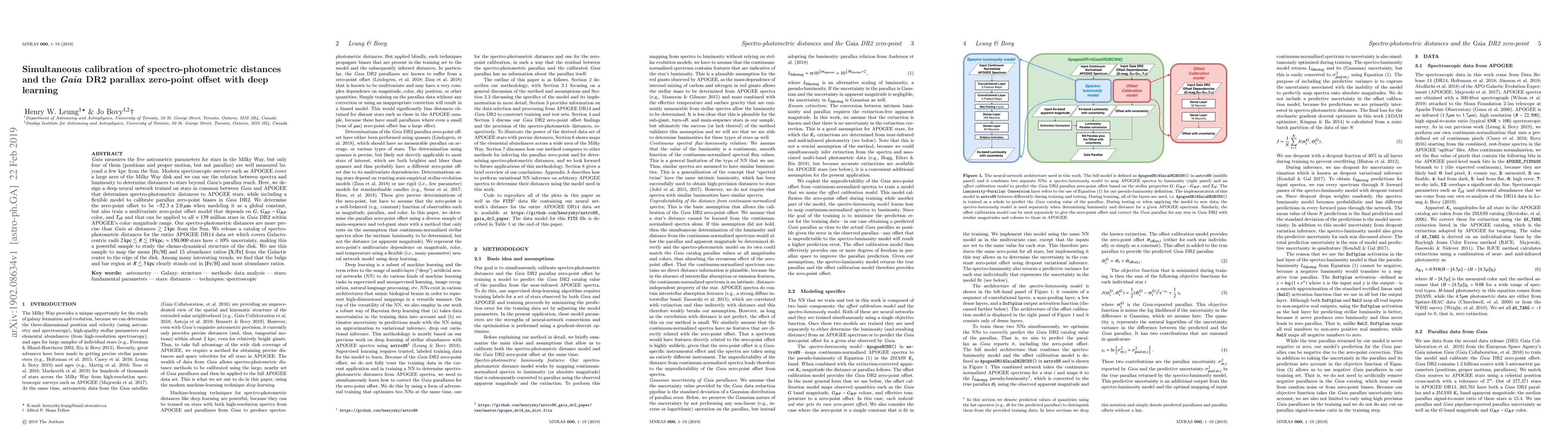 This paper uses a deep neural network to calibrate spectro-photometric distances and the Gaia DR2 parallax zero-point offset, achieving more precise distances beyond Gaia's parallax reach. The parallax zero-point offset is found to be $-52.3 \pm 2.0$ uas, and the study provides a catalog of distances for 150,000 stars with <10% uncertainty, enabling detailed mapping of Galactic chemical and dynamical structure.