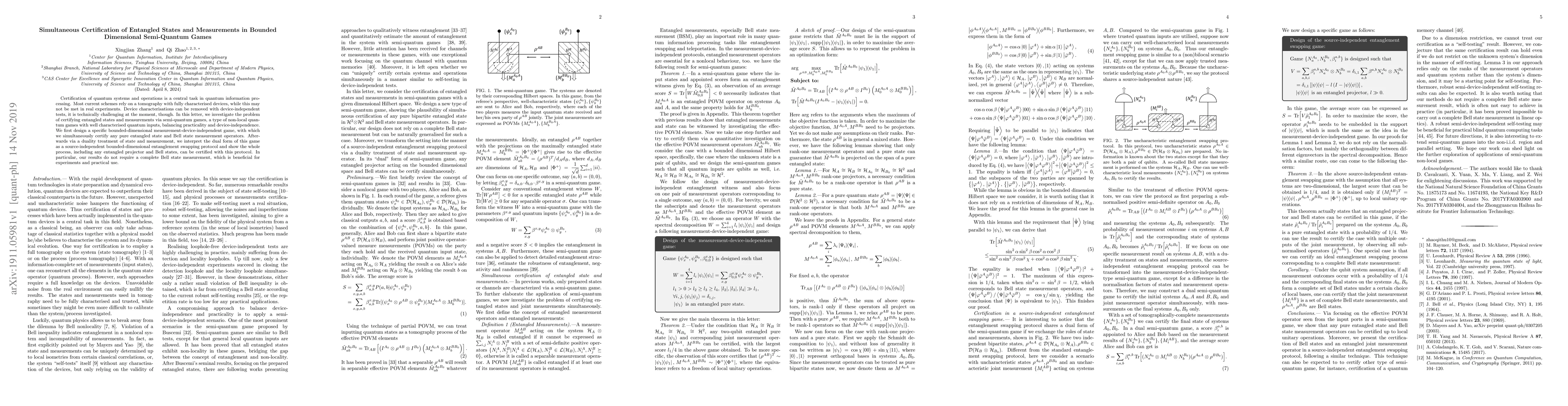 This paper proposes a device-independent method for certifying entangled quantum states and measurement operators using semi-quantum games, achieving certification without full device characterization. The method certifies pure entangled states and Bell state measurement operators in a bounded-dimensional semi-quantum game, offering practical benefits for experimental applications.