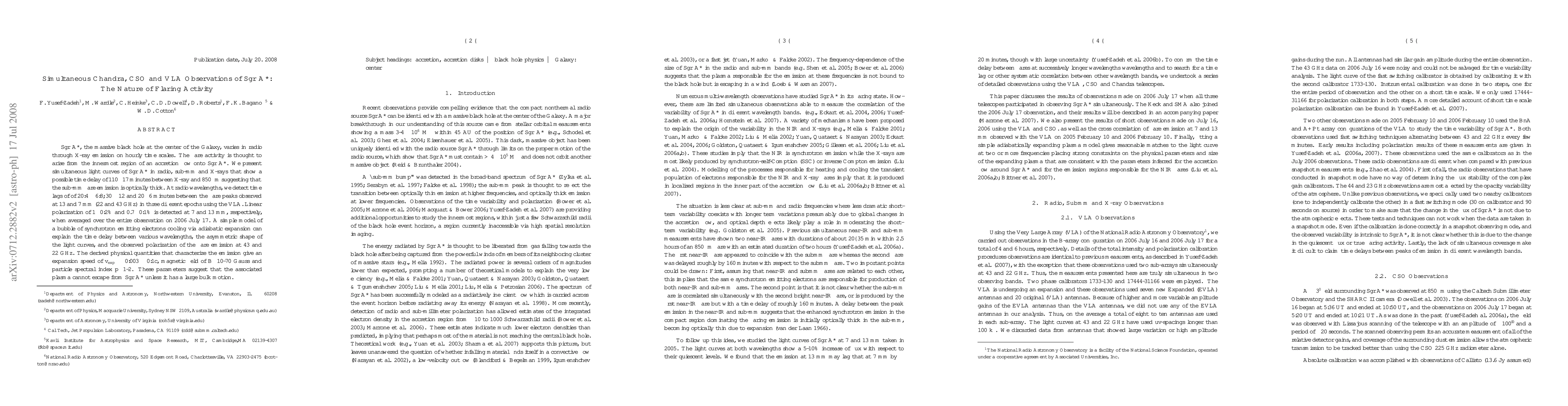 This research investigates flaring activity around Sgr A*, the supermassive black hole at the galaxy's center, using simultaneous observations from Chandra, CSO, and VLA. The study finds time delays between X-ray and sub-mm flares, indicating optically thick sub-mm emission, and models the flares as synchrotron emission from electrons in a cooling bubble, yielding parameters like expansion speed, magnetic field, and particle spectral index.