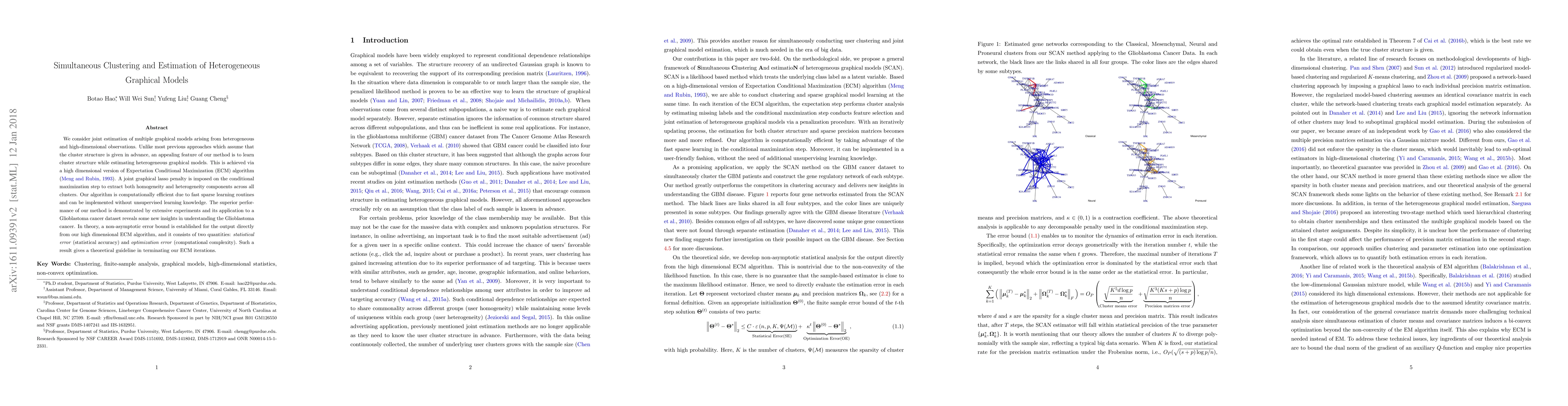 This paper proposes a method for jointly estimating multiple heterogeneous graphical models while simultaneously learning the underlying cluster structure using an enhanced ECM algorithm. It demonstrates superior performance through experiments and provides theoretical error bounds to guide the algorithm's termination.