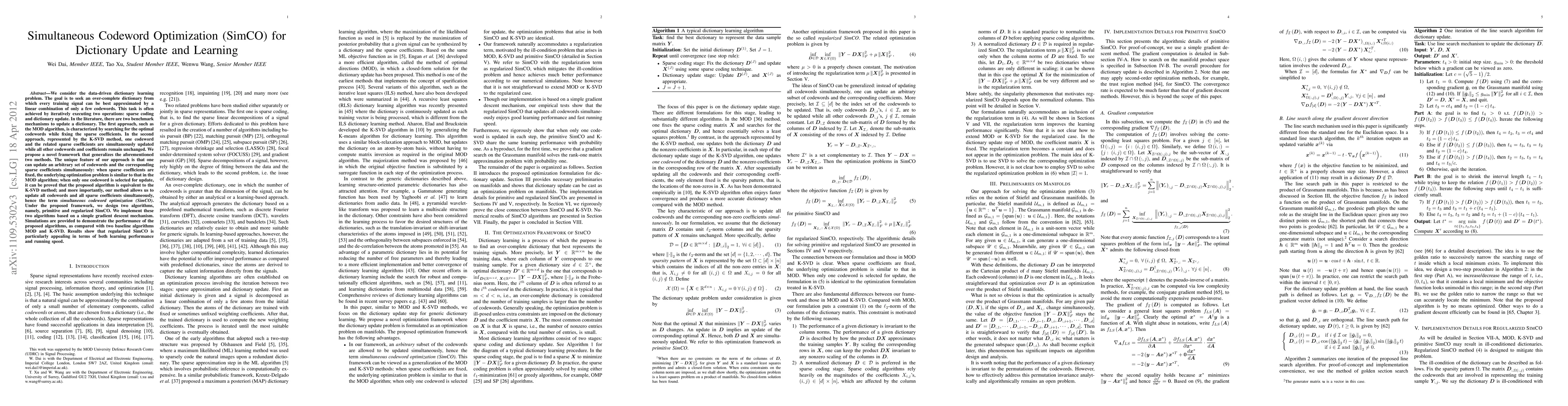 The paper proposes a novel framework called Simultaneous Codeword Optimization (SimCO) for dictionary update and learning, which allows for the simultaneous optimization of any subset of codewords and their corresponding sparse coefficients. This method generalizes existing approaches by enabling updates to all codewords and coefficients, and is shown to outperform baseline algorithms in terms of both learning performance and speed.