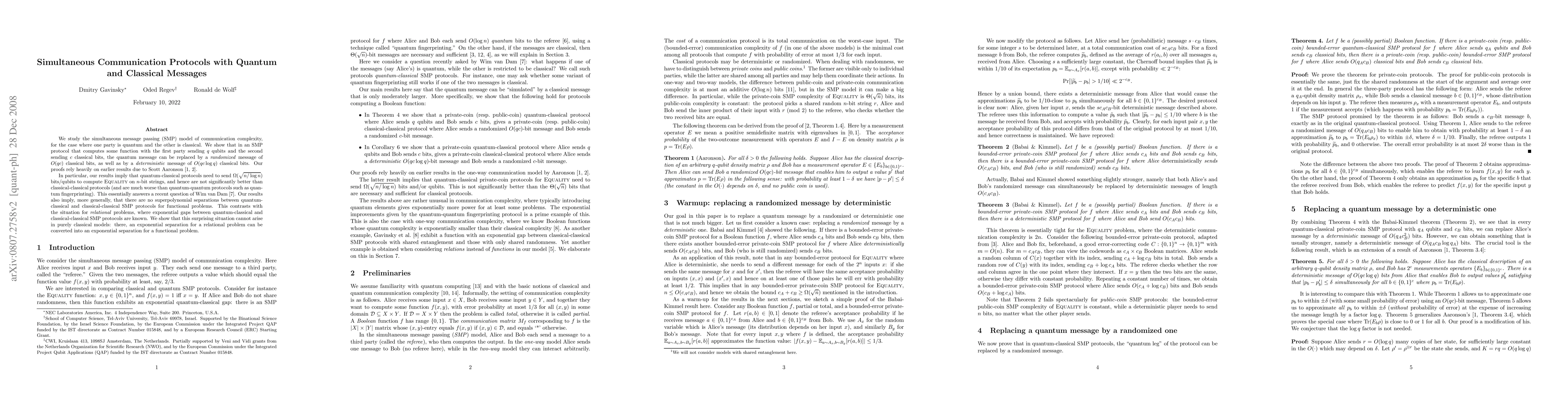 We study the simultaneous message passing (SMP) model of communication complexity, for the case where one party is quantum and the other is classical. We show that in an SMP protocol that computes some function with the first party sending q qubits and the second sending c classical bits, the quantum message can be replaced by a randomized message of O(qc) classical bits, as well as by a deterministic message of O(q c log q) classical bits. Our proofs rely heavily on earlier results due to Scott Aaronson. In particular, our results imply that quantum-classical protocols need to send Omega(sqrt{n/log n}) bits/qubits to compute Equality on n-bit strings, and hence are not significantly better than classical-classical protocols (and are much worse than quantum-quantum protocols such as quantum fingerprinting). This essentially answers a recent question of Wim van Dam. Our results also imply, more generally, that there are no superpolynomial separations between quantum-classical and classical-classical SMP protocols for functional problems. This contrasts with the situation for relational problems, where exponential gaps between quantum-classical and classical-classical SMP protocols are known. We show that this surprising situation cannot arise in purely classical models: there, an exponential separation for a relational problem can be converted into an exponential separation for a functional problem.