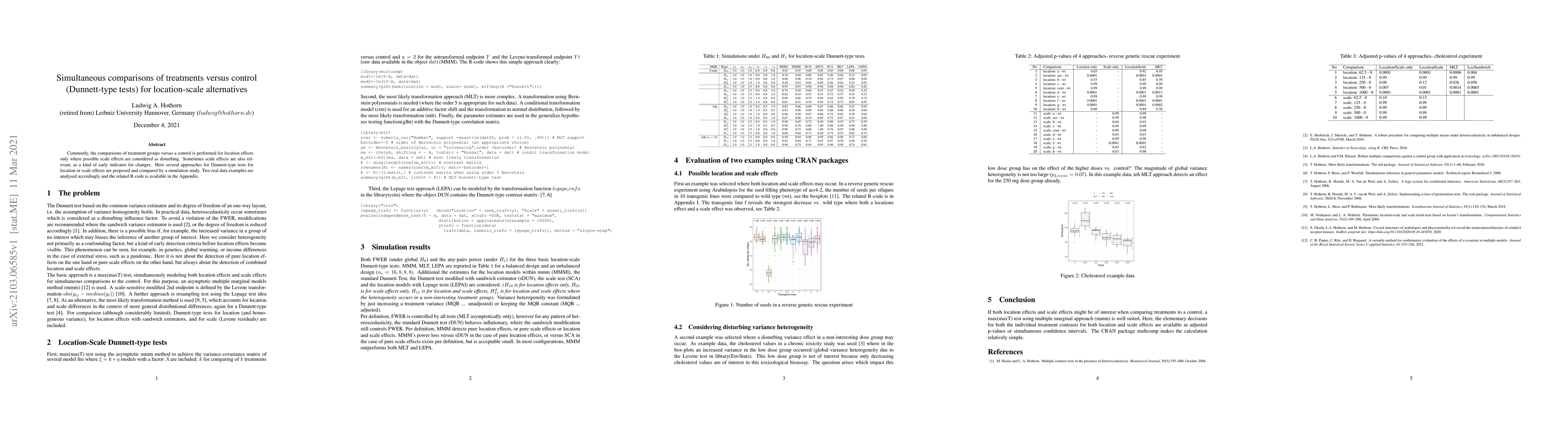 Commonly, the comparisons of treatment groups versus a control is performed for location effects only where possible scale effects are considered as disturbing. Sometimes scale effects are also relevant, as a kind of early indicator for changes. Here several approaches for Dunnett-type tests for location or scale effects are proposed and compared by a simulation study. Two real data examples are analysed accordingly and the related R-code is available in the Appendix.